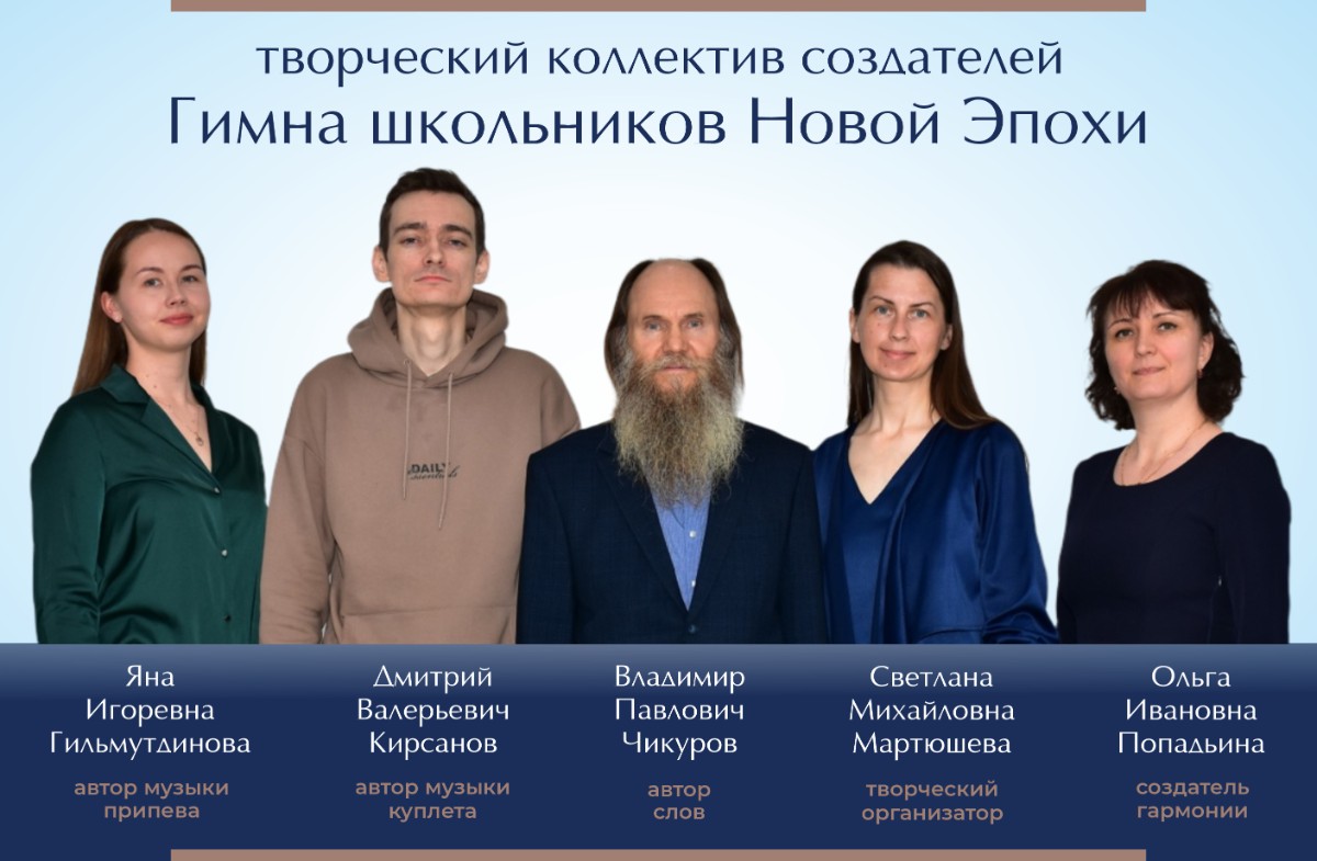 Гимн школьников Новой Эпохи родился в городе Чайковском. Над его созданием трудился творческий коллектив во главе с членом-корреспондентом Международной академии наук и искусств, поэтом, писателем, учредителем культурно-просветительского Фонда «Светлая Идея» Владимиром Павловичем Чикуровым.