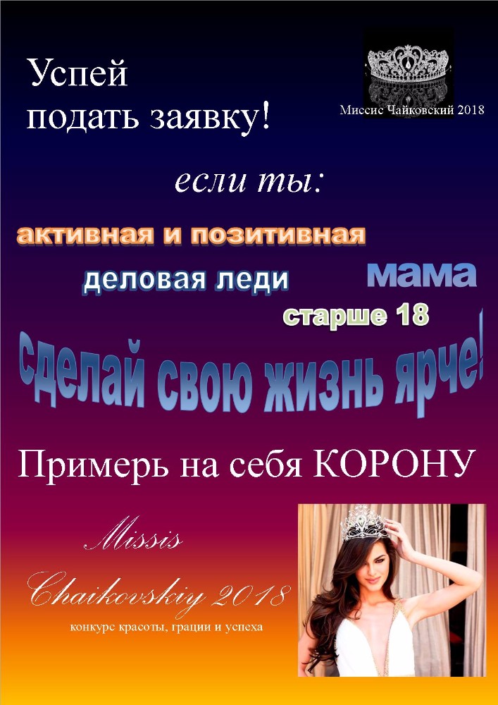 В Чайковском впервые состоится конкурс красоты «Миссис Чайковский-18». Побороться за звание самой-самой приглашают жительниц города Чайковский и района в возрасте от 18 до 47 лет, имеющих детей.