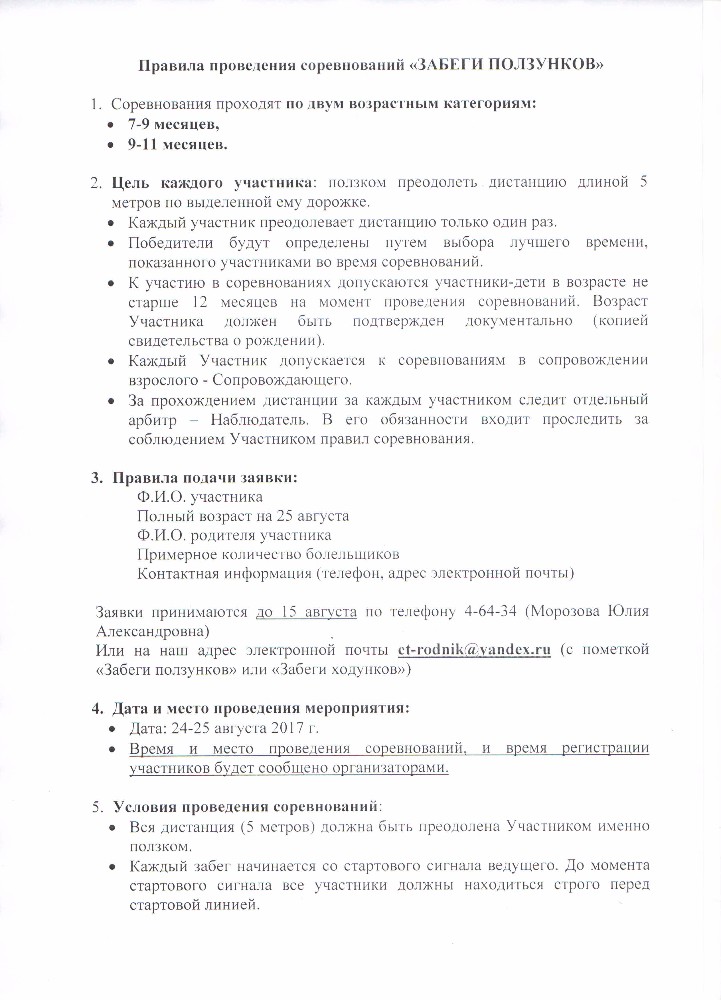 Заявки на участие принимаются до 15 августа на электронный адрес ct-rodnik@yandex.ru с пометкой «Парад колясок», «Забеги ползунков» или «Забеги ходунков». Справки по телефону 4-64-34 (Морозова Юлия Александровна).