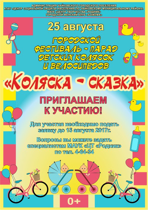 В Чайковском стартовал приём заявок на участие в городском фестивале-параде детских колясок и велосипедов «Коляска-сказка», который состоится 25 августа. В этом году фестиваль пройдёт в третий раз и приурочен к предстоящему чемпионату мира по летнему биатлону. Принять участие в параде могут все желающие мамы и папы, бабушки и дедушки, а также самые маленькие жители края. Главное условие участия — ярко и с фантазией украшенная детская коляска или велосипед.