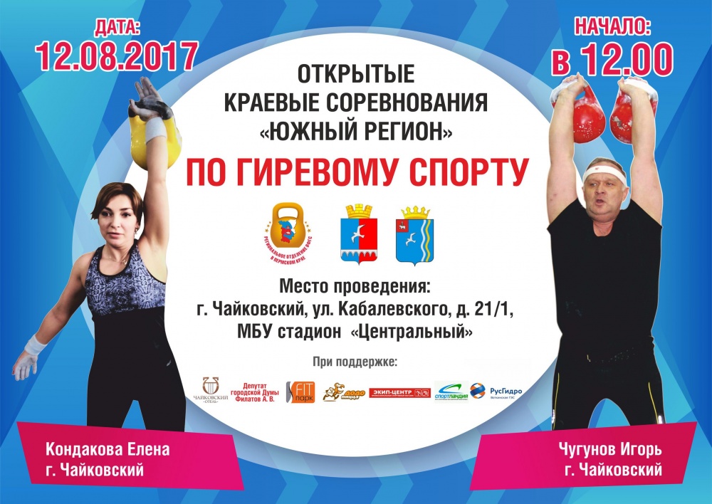 В Чайковском 12 августа состоятся открытые краевые соревнования по гиревому спорту «Южный регион». Организаторами соревнований выступают региональное отделение Всероссийской федерации гиревого спорта в Пермском крае, Комитет по физической культуре, спорту и туризму администрации Чайковского городского поселения и Отдел физической культуры и спорта администрации Чайковского муниципального района.