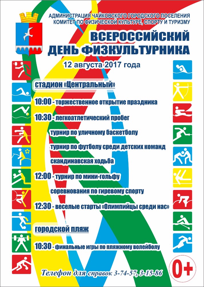 В субботу, 12 августа, в Чайковском, как и по всей территории России, пройдут спортивные мероприятия, приуроченные к празднованию Дня физкультурника. Ежегодно этот праздник отмечается каждую вторую субботу августа.