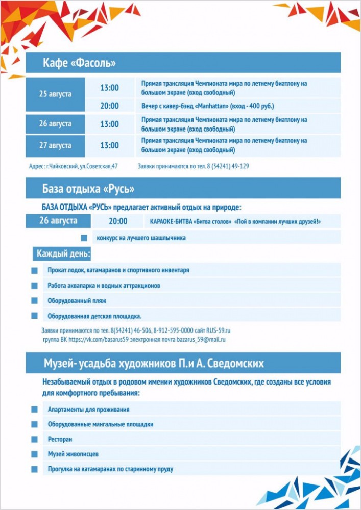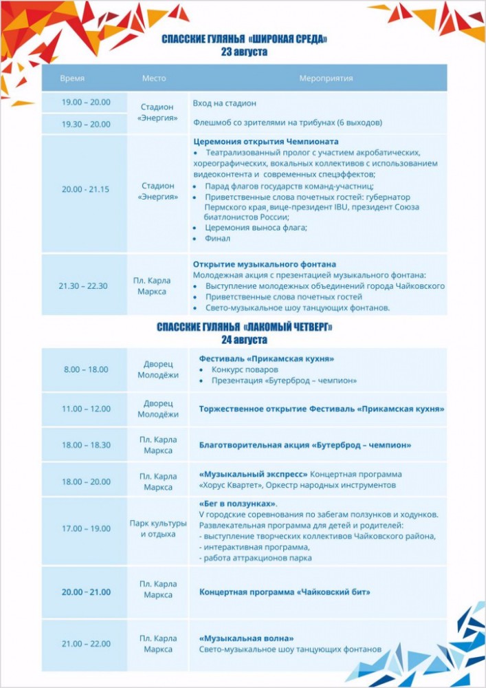 В программу спортивных и культурных мероприятий во время проведения Чемпионата мира по летнему биатлону в Чайковском внесены изменения. Об этом сообщается на официальном сайте администрации Чайковского городского поселения.