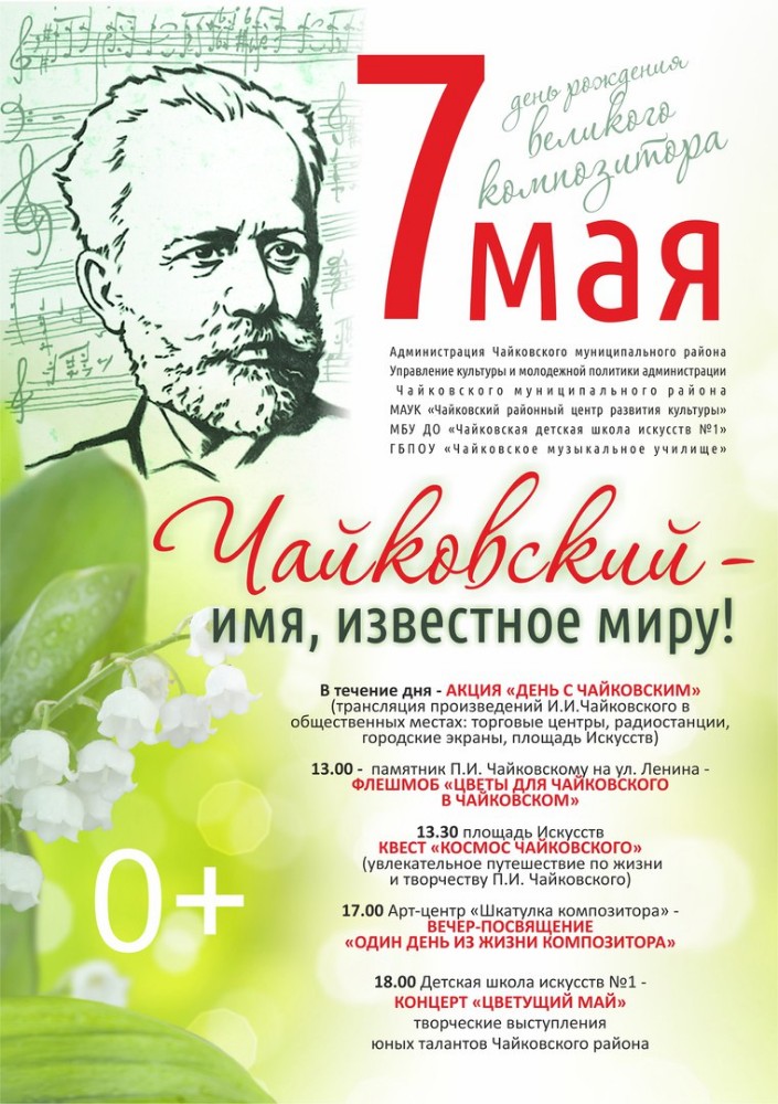 В 13.00 у памятника П.И. Чайковскому на улице Ленина будет проходить флешмоб «Цветы для Чайковского в Чайковском», а в 13.30 участники квеста «Космос Чайковского» смогут отправиться в увлекательное путешествие по жизни и творчеству композитора.