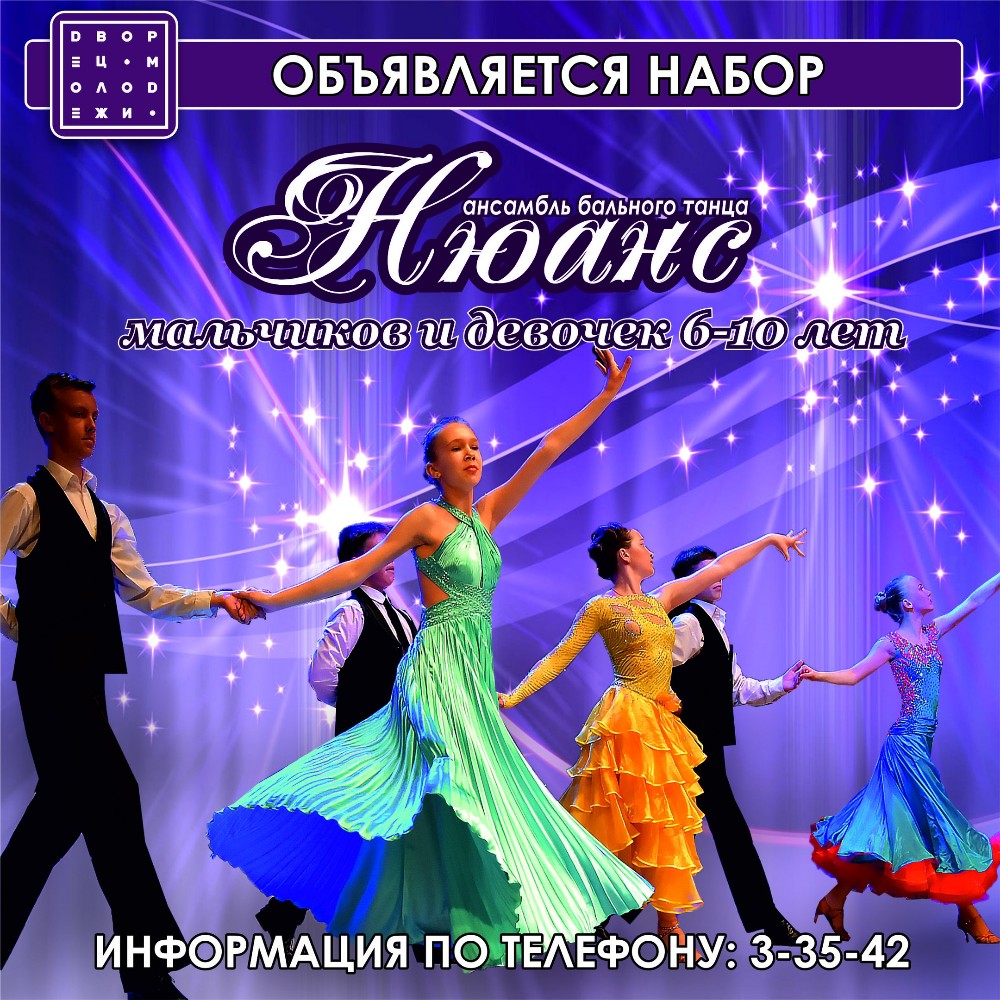 1) Ансамбль бального танца «Нюанс» (руководитель - Игонина Татьяна Алексеевна). Приём мальчиков и девочек в младшую группу с 6 лет, в старшую - с 10 лет.