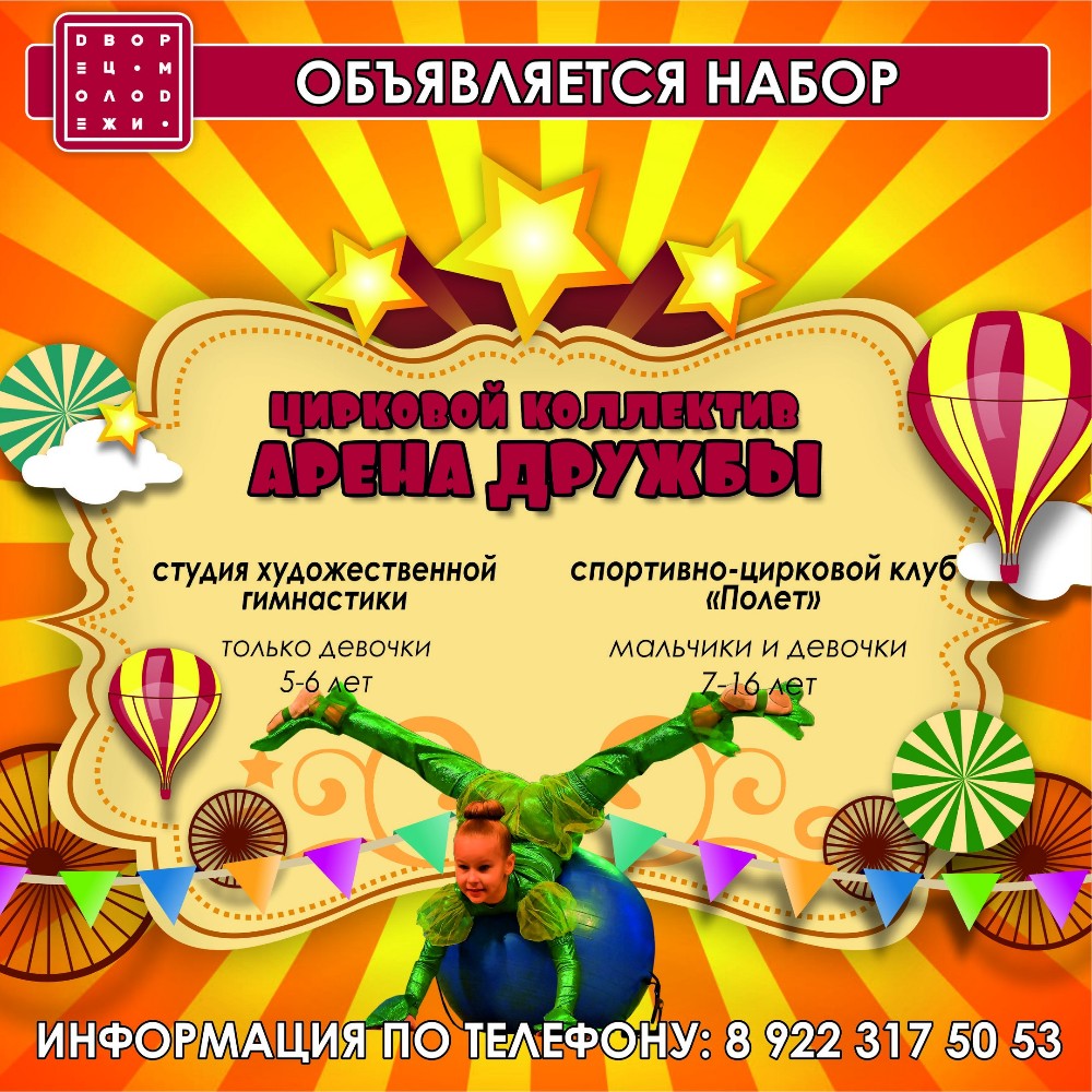 5) Цирковой коллектив «Арена Дружбы» (руководитель Липатова Раиса Анатольевна) объявляет набор в спортивно-цирковой клуб «Полёт» с 7 до 16 лет; в студию художественной гимнастики принимаются девочки 5-6 лет.