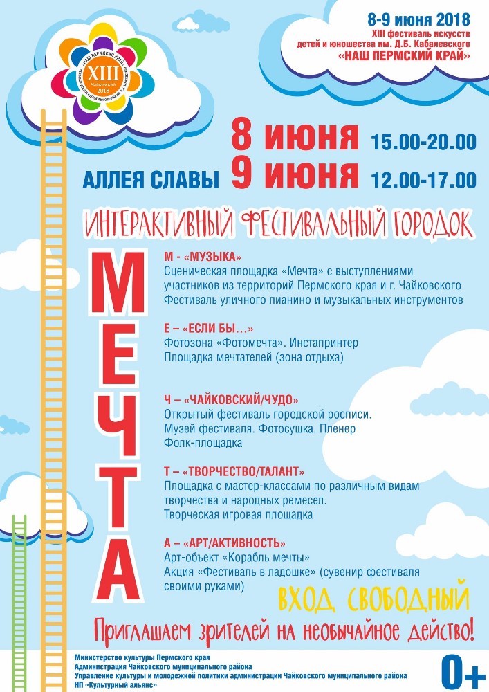 Качественный звук, яркие события, живой вокал. На главной сцене интерактивного фестивального городка «МЕЧТА» представят фееричную программу коллектив студентов сольного и хорового народного пения Пермского краевого колледжа искусств и культуры. Сцена продолжит свою работу 9 июня: с 13.00 до 17.00. Свои творческие достижения представят солисты и ансамбли Пермского края и Чайковского муниципального района. Танцевальные, вокальные, театральные коллективы и солисты, театр моды будут радовать зрителя лучшими номерами.