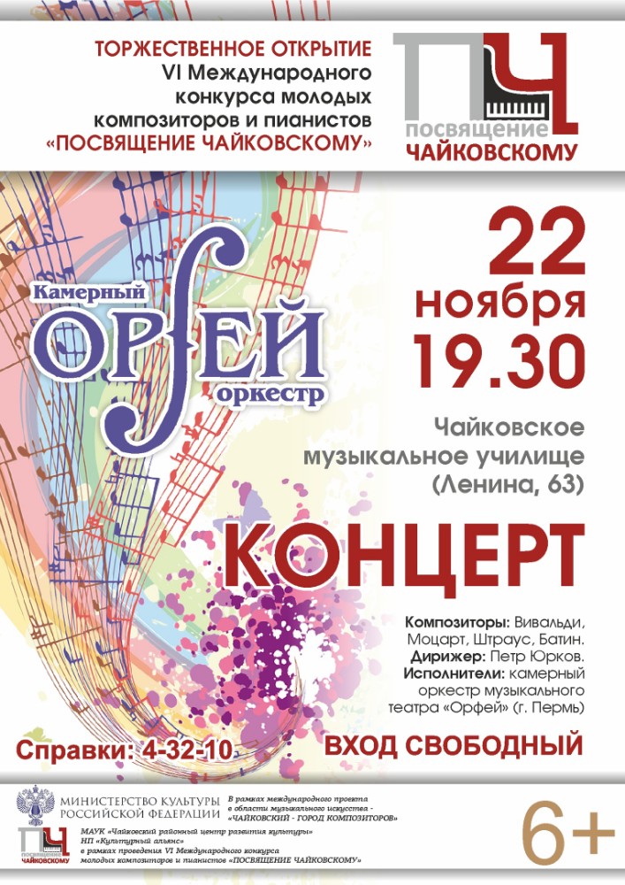 Торжественное открытие музыкального конкурса состоится сегодня, 22 ноября, в концертном зале Чайковского музыкального училища. В этот вечер свой концерт даст Камерный оркестр музыкального театра «Орфей» (Пермь). Со сцены прозвучат произведения известных композиторов: Вивальди, Моцарт, Штраус, Батин.