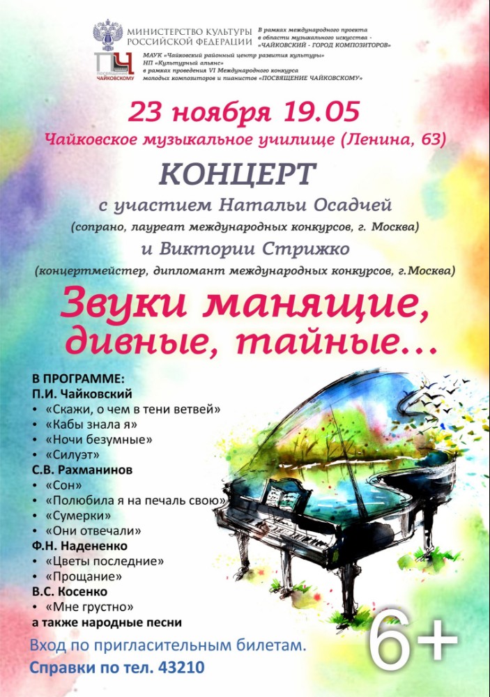 Завтра, 23 ноября, концертный зал Чайковского музыкального училища вновь дружелюбно распахнет двери для любителей и ценителей музыкального искусства. В этот вечер там пройдёт концерт «Звуки манящие, дивные, тайные...» с участием Натальи Осадчей (сопрано, лауреат международных конкурсов, г. Москва) и Виктории Стрижко (концертмейстер, дипломант международных конкурсов, г.Москва). В программе концерта произведения П.И. Чайковского, С.В. Рахманинова, Ф.Н. Надененко, В.С. Костенко.