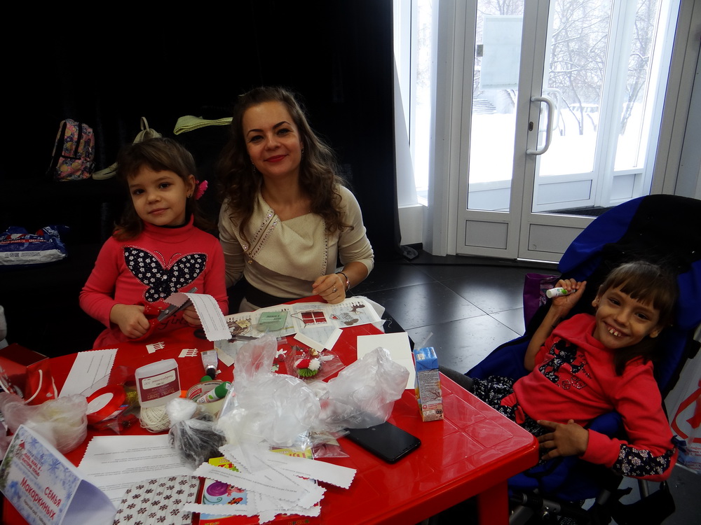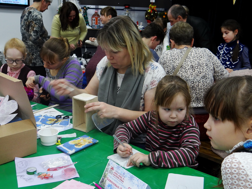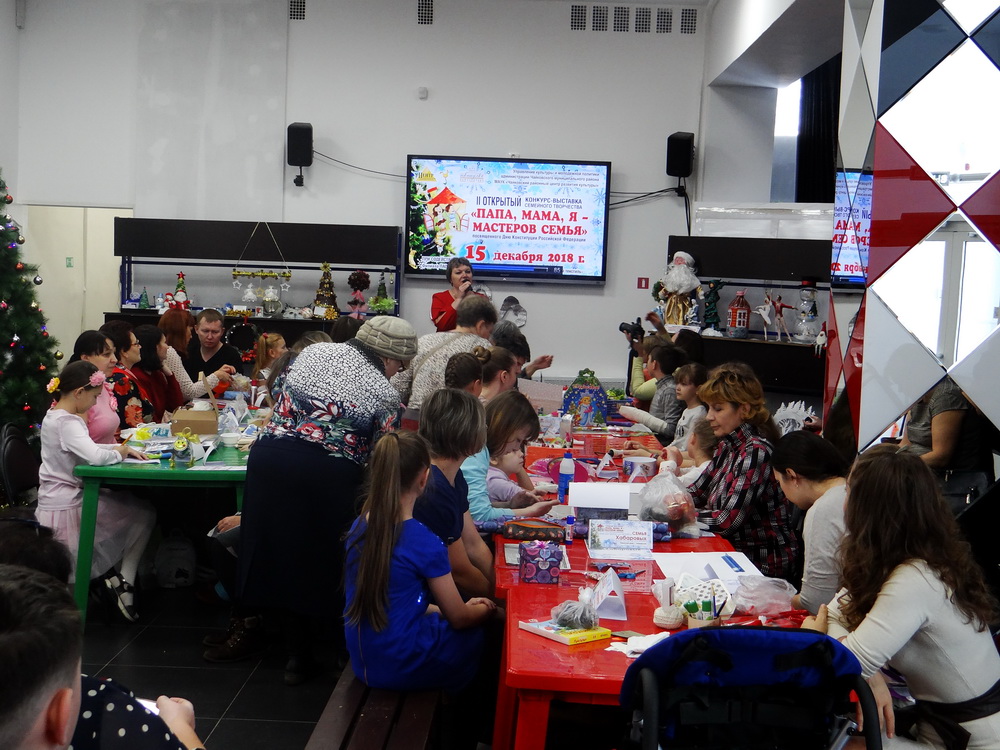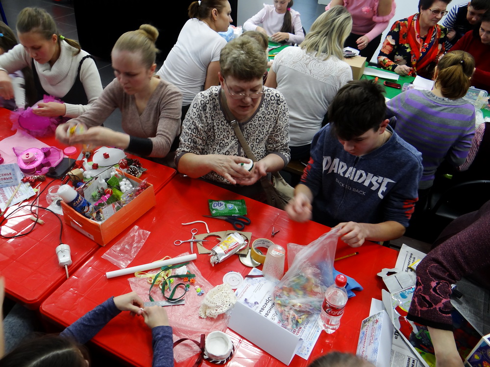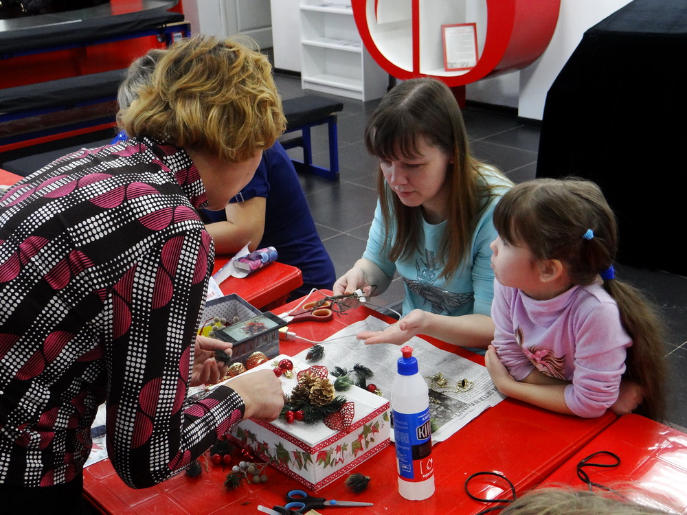 Одновременно в Арт-центре были проведены бесплатные мастер-классы педагогами ДДТ «Искорка»: «Новогодняя открытка в технике скрапбукинг», «Айрис-фолдинг «Новогодний гном», «Символ года». А так как само изделие изготавливается членами семьи или её отдельными представителями на месте, то многие ребятишки с огромным удовольствием стали участниками мастер-классов.