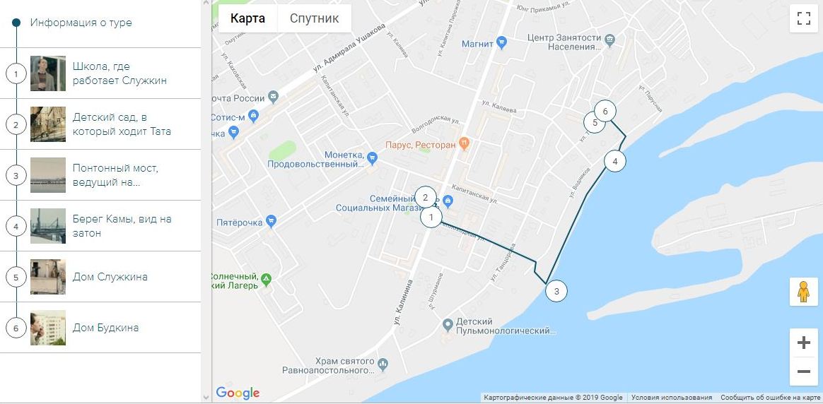 Бесплатный аудиогид содержит шесть мест, расположенных в Закамске. Это школа №1 в микрорайоне Старые Водники, где снимали фильм. Здесь учился и сам писатель. Недалеко отсюда находится детский сад, в который ходила маленькая дочь главного героя Служкина и его жены Нади — Тата. Есть в гиде понтонный мост и затон Камы — любимое место Служкина, его дом и соседний дом лучшего друга учителя — Будкина.
