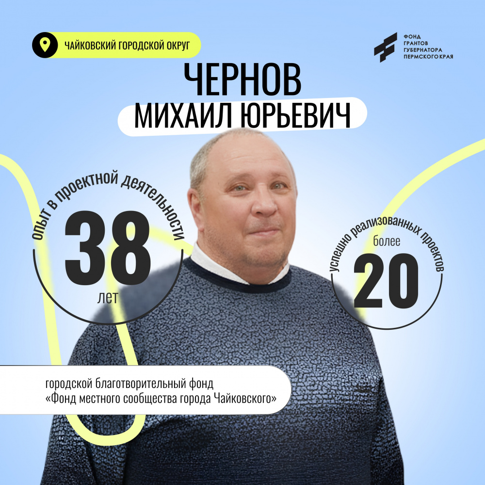 В Чайковском округе консультантом Фонда грантов губернатора Пермского края стал Чернов Михаил Юрьевич, который имеет многолетний опыт работы в некоммерческом секторе. Руководитель более 25 крупных проектов, одержано 9 побед в конкурсах Фонда президентских грантов, Фонда губернатора Пермского края и других. Непрерывно повышает свою квалификацию с 2010 года.