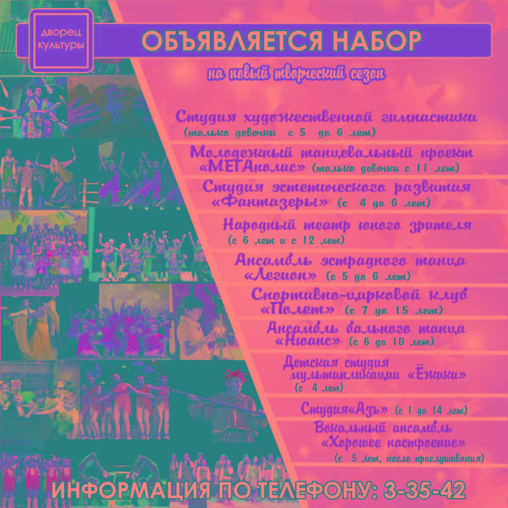 Культурно-массовые мероприятия в бывшем Дворце молодёжи всё ещё «на стопе», однако уже сейчас ведётся набор в творческие коллективы учреждения на предстоящий сезон.