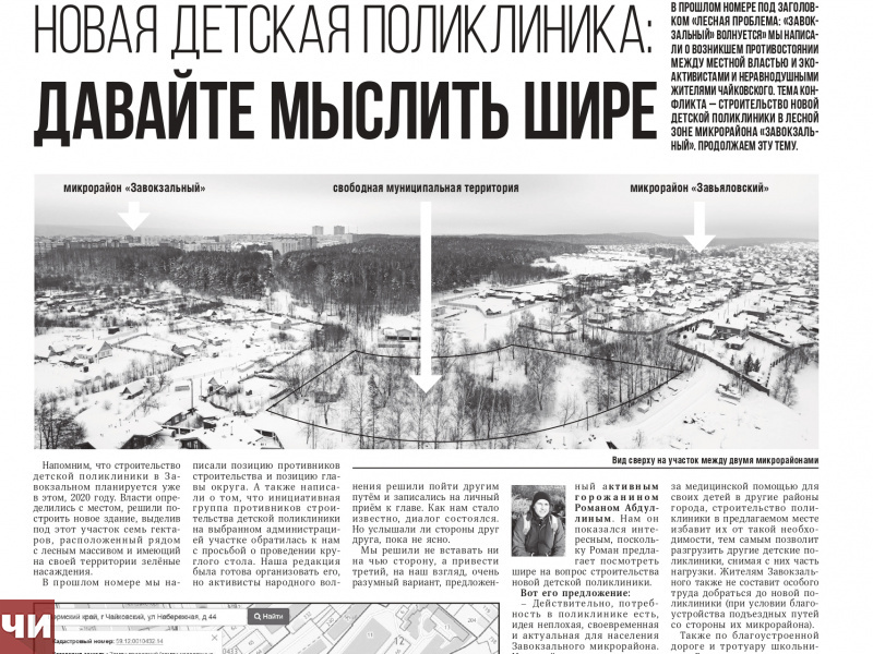 Целый год в Чайковском длилось противостояние между местной властью и неравнодушными жителями города. Причина конфликта – строительство новой детской поликлиники в лесной зоне микрорайона «Завокзальный». Жители не раз обращались в администрацию, дабы урегулировать данный вопрос. В итоге мирно решить конфликт не получилось, и стороны ушли в суды.