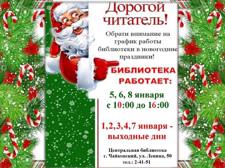 Публикуем графики работ чайковских больниц и поликлиник, почты, МФЦ, ЗАГСа и других учреждений на новогодние праздники.