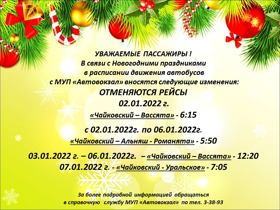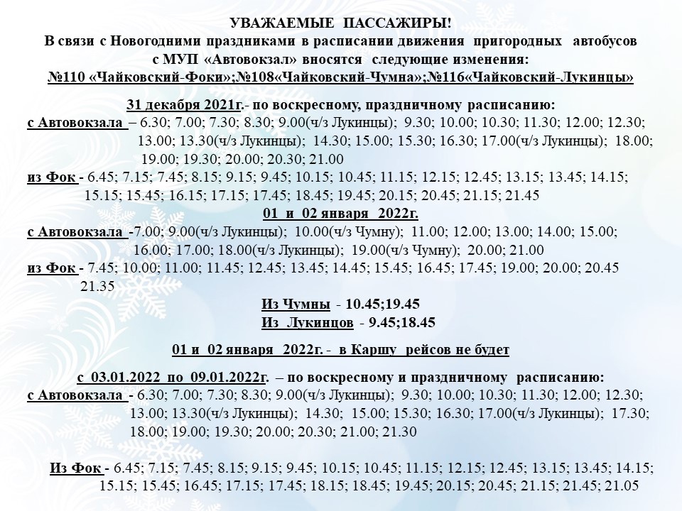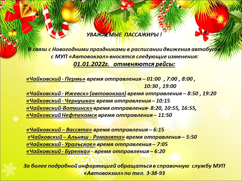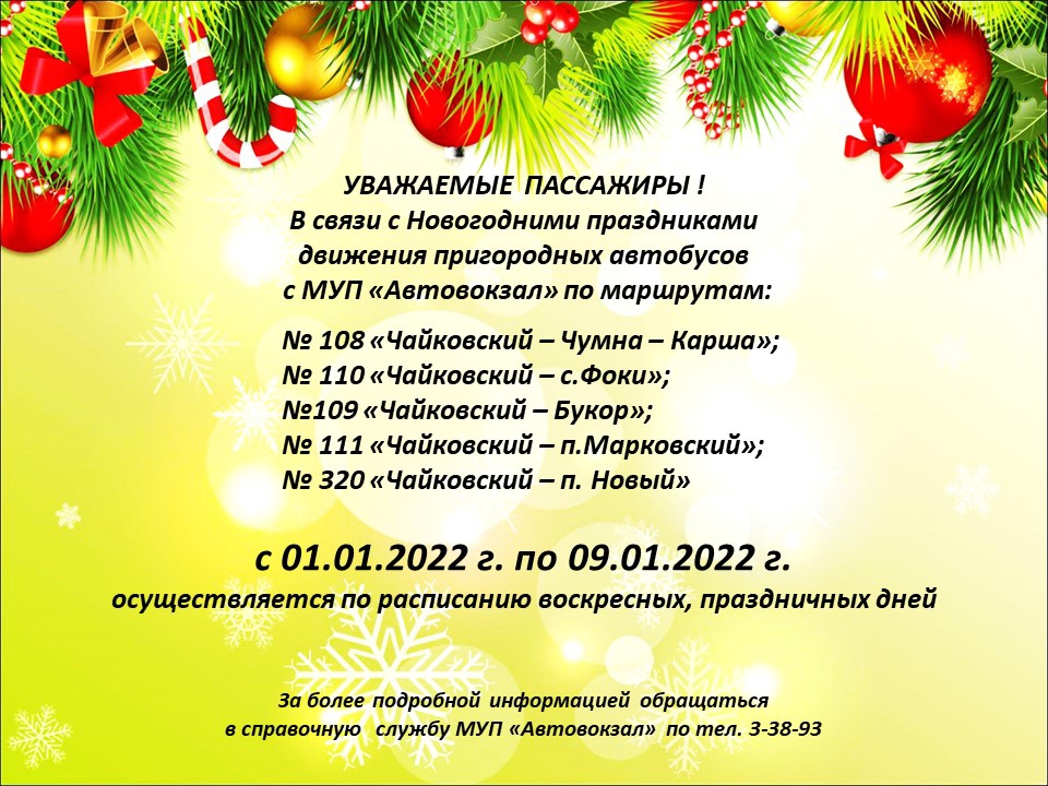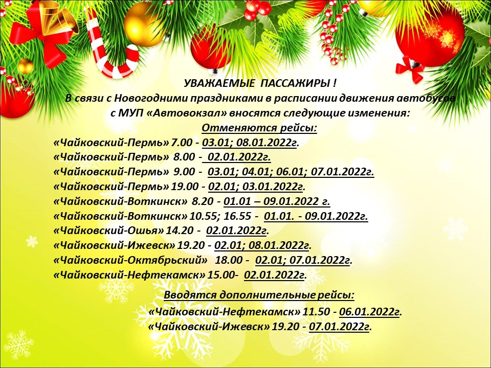 С 1 по 9 января в Пермском крае – официально нерабочие дни. Мы узнали, как будут работать в Чайковском медицинские организации, почта, МФЦ, ЗАГС и другие организации. Также в материале можно ознакомиться с изменённым на новогодние каникулы расписанием движения автобусов с автовокзала.