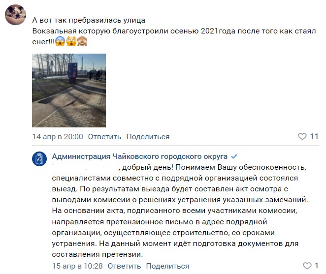«Понимаем Вашу обеспокоенность, специалистами совместно с подрядной организацией состоялся выезд. По результатам выезда будет составлен акт осмотра с выводами комиссии о решениях устранения указанных замечаний. На основании акта, подписанного всеми участниками комиссии, направляется претензионное письмо в адрес подрядной организации, осуществляющее строительство, со сроками устранения. На данный момент идёт подготовка документов для составления претензии», - ответила администрация Чайковского городского округа на комментарии жителей в сообществе нашего издания.