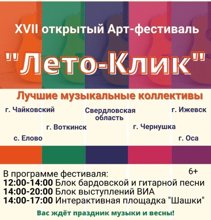 И, наконец, это воскресенье в Чайковском станет одним из самых ярких за всю весну для ценителей живой музыки – в нашем городе состоится музыкальный фестиваль «Лето-Клик», а это целых восемь часов музыки! В программе мероприятия заявлены известные и начинающие барды нашего города, а также молодёжные и прочие группы Чайковского, Прикамья и гостей из соседних регионов.