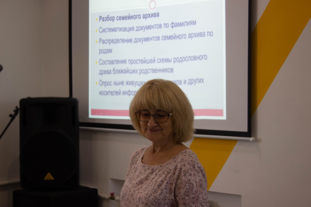 Во время встречи Елена Черных рассказала о том, почему каждому человеку важно знать о своём родословии хотя бы до седьмого поколения. По словам специалиста, именно первые семь поколений формируют в нашей жизни определённые аспекты: