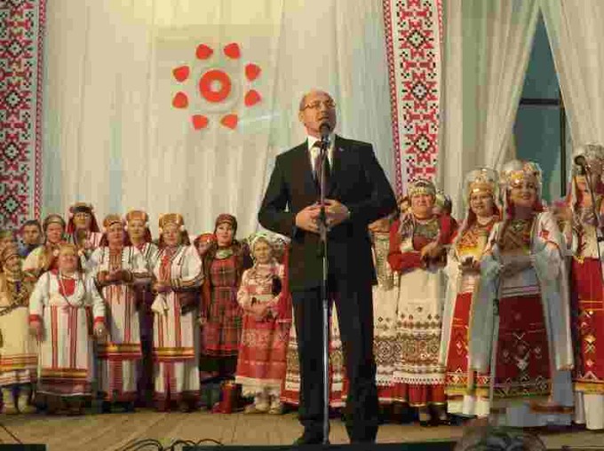 Делегацию «Золотой осени», равно как и других участников, хозяева встретили радушно – с песнями и угощениями. Участники ансамбля попробовали национальное блюдо, «табани», и напиток, «кубышку». Далее началась настоящая народная церемония приема гостей: всем предстояло пройти трое ворот. Первые были оформлены веточками рябины, священного дерева и оберега удмуртского народа, вторые и третьи означали счастье и благополучие. Проходя через каждые ворота, гостям нужно было загадывать желания. На первых воротах им нужно было завязать ленточку, на остальных – позвонить в колокольчики, чтобы желание сбылось. Прием гостей превратился в шумное веселье.