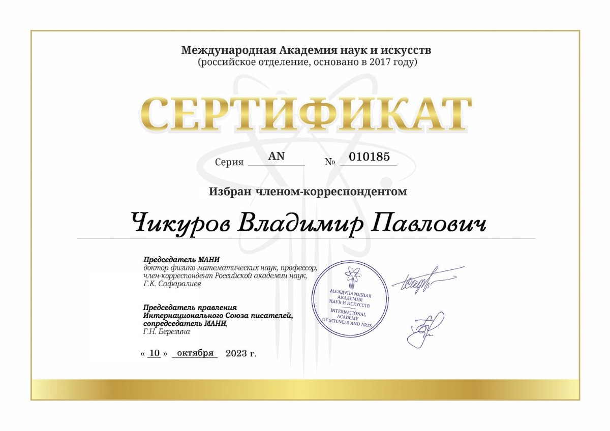 Войти в ряды этой значимой организации удостоился и наш земляк Владимир Павлович Чикуров. На днях он получил сертификат, подтверждающий его новый статус члена-корреспондента Международной Академии наук и искусств за подписью председателя МАНИ, доктора физико-математических наук, профессора, члена-корреспондента РАН Гаджимета Сафаралиева.