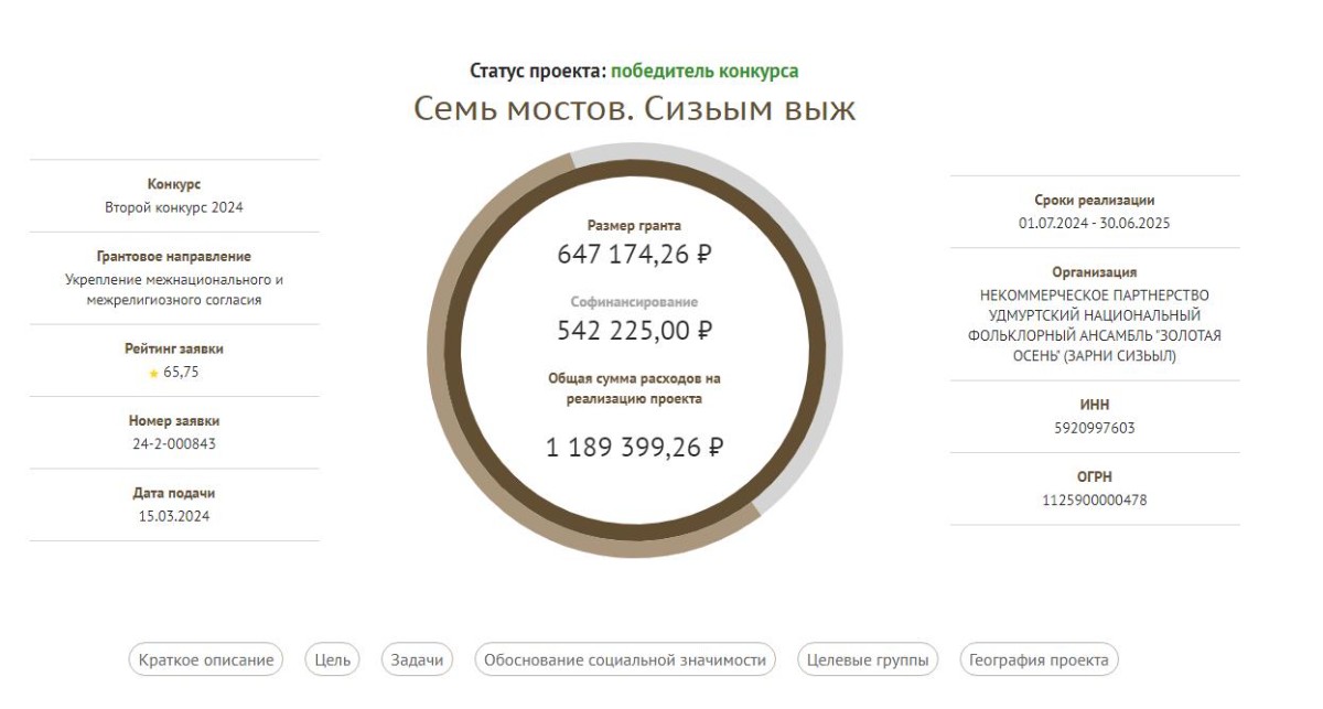 На днях были объявлены победители второго в 2024 году конкурса Фонда президентских грантов. Из восьми чайковских проектов поданных на конкурс грантовую поддержку получит только один – культурно-просветительский проект «Семь мостов . Сизьым выж» .