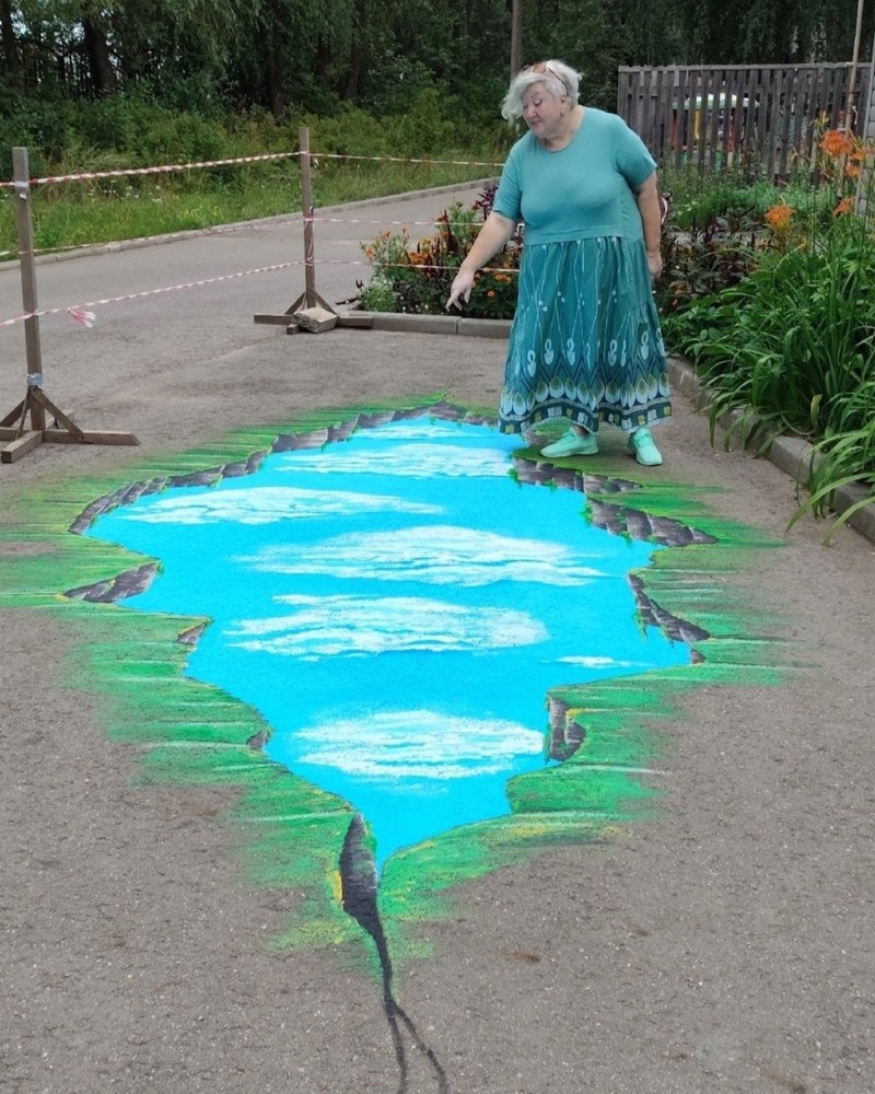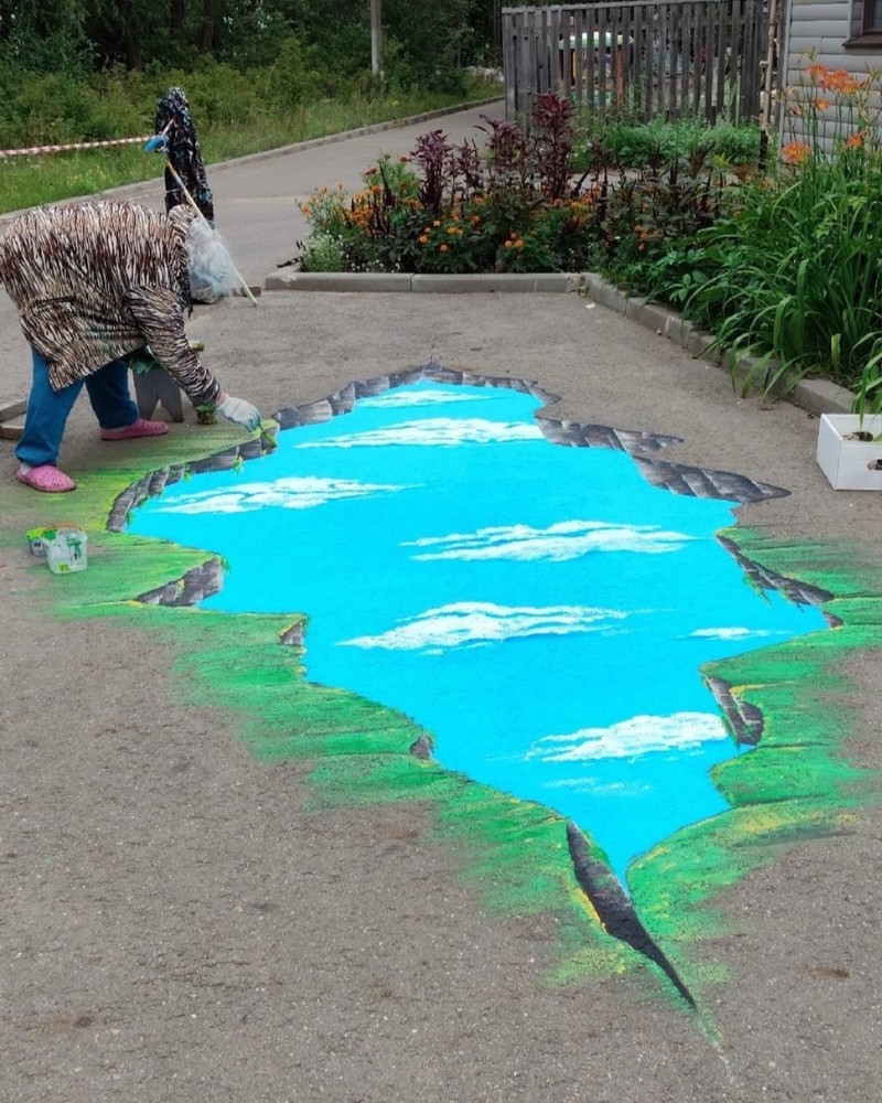 Рисунок на асфальте выполнен в 3D-технике и находится слева от здания автодрома напротив птичника. В провал, по словам Ольги Лобачевой, можно заглянуть, встав на одну из самых дальних точек рисунка.