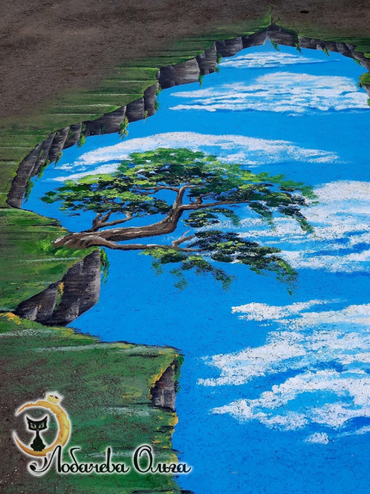 На краю обрыва «растёт» дерево, нависающее над пропастью. Оно по замыслу художниц символизирует собой неистребимость и вездесущность жизни, крепость духа и желание жить несмотря ни на что.