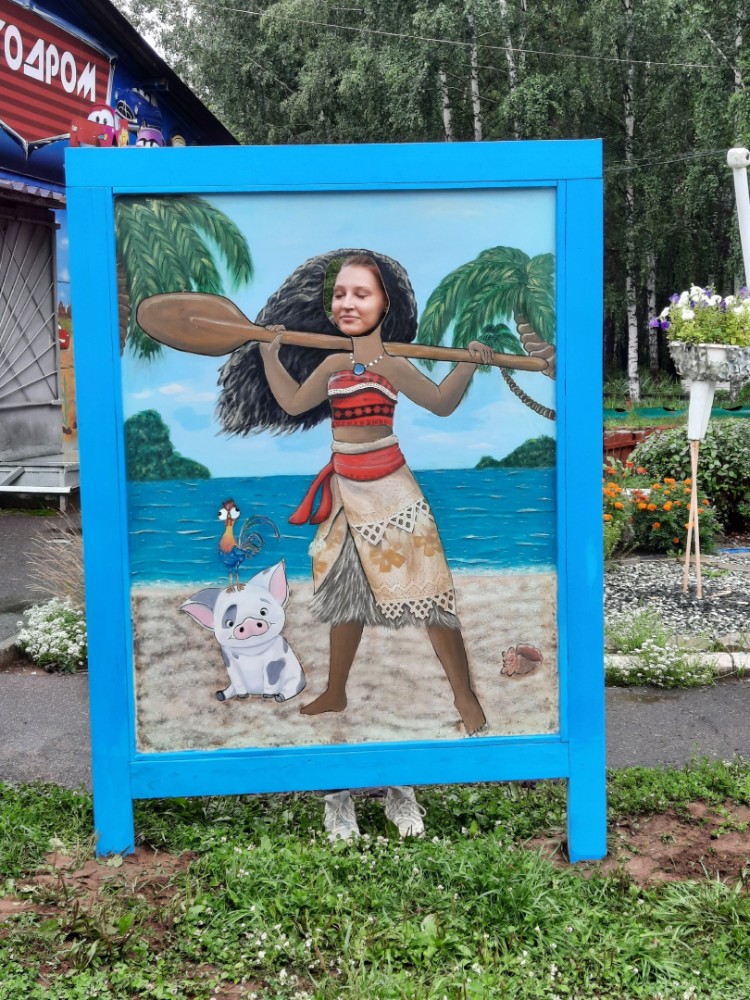 Вторая фотозона выполнена в более традиционном варианте и предназначена для фотографирования в виде героев мультфильма «Моана»: юной дочери вождя или ее отца Туи. Для этого нужно лишь поместить свое лицо в специально созданное для этого отверстие в картине.