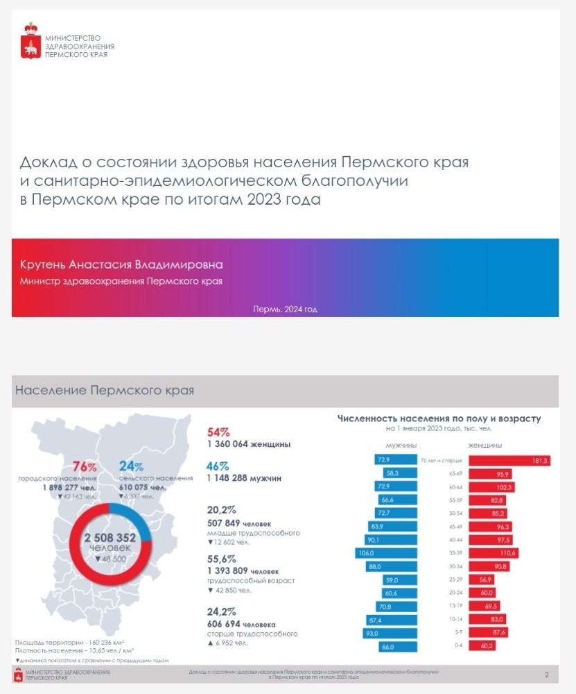 В Пермском крае проживает на 4,8 % женщин больше, чем мужчин. Такие данные привела министр здравоохранения Пермского края Анастасия Крутень в докладе о состоянии здоровья населения региона по итогам 2023 года.