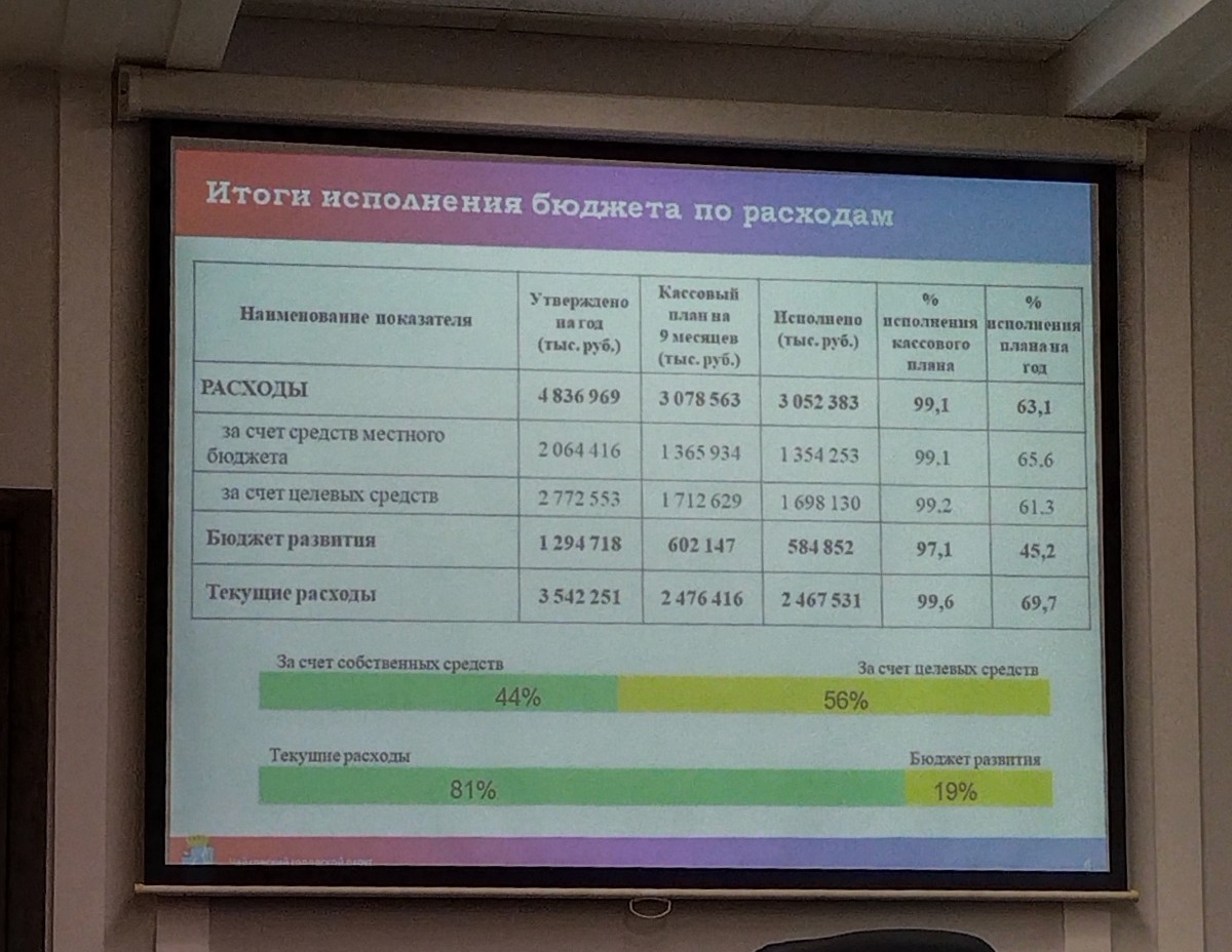 Расходы зафиксированы на уровне 3,052 млрд рублей (99,1%). В этой сумме доля собственных средств составила 44%, целевых средств – 56%. Профицит бюджета – 168 млн рублей. Бюджет развития – почти 585 млн рублей (19%), текущие расходы – 2,467 млрд рублей (81%).