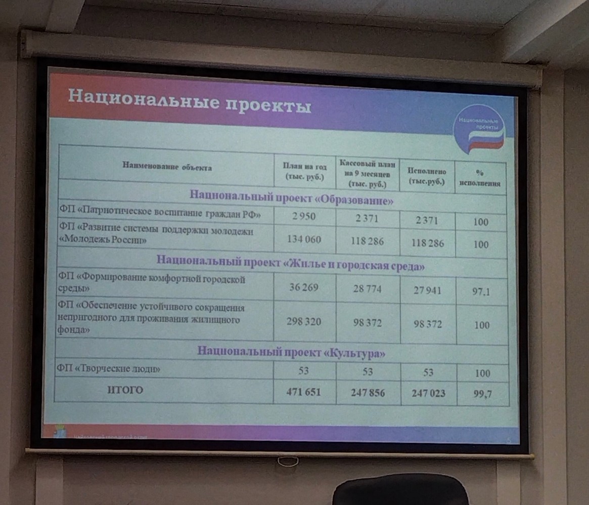 На реализацию федеральных проектов в рамках трёх нацпроектов – «Образование», «Жильё и городская среда» и «Культура» – за 9 месяцев направлено 247 млн рублей, что составляет 52% от годовых значений.