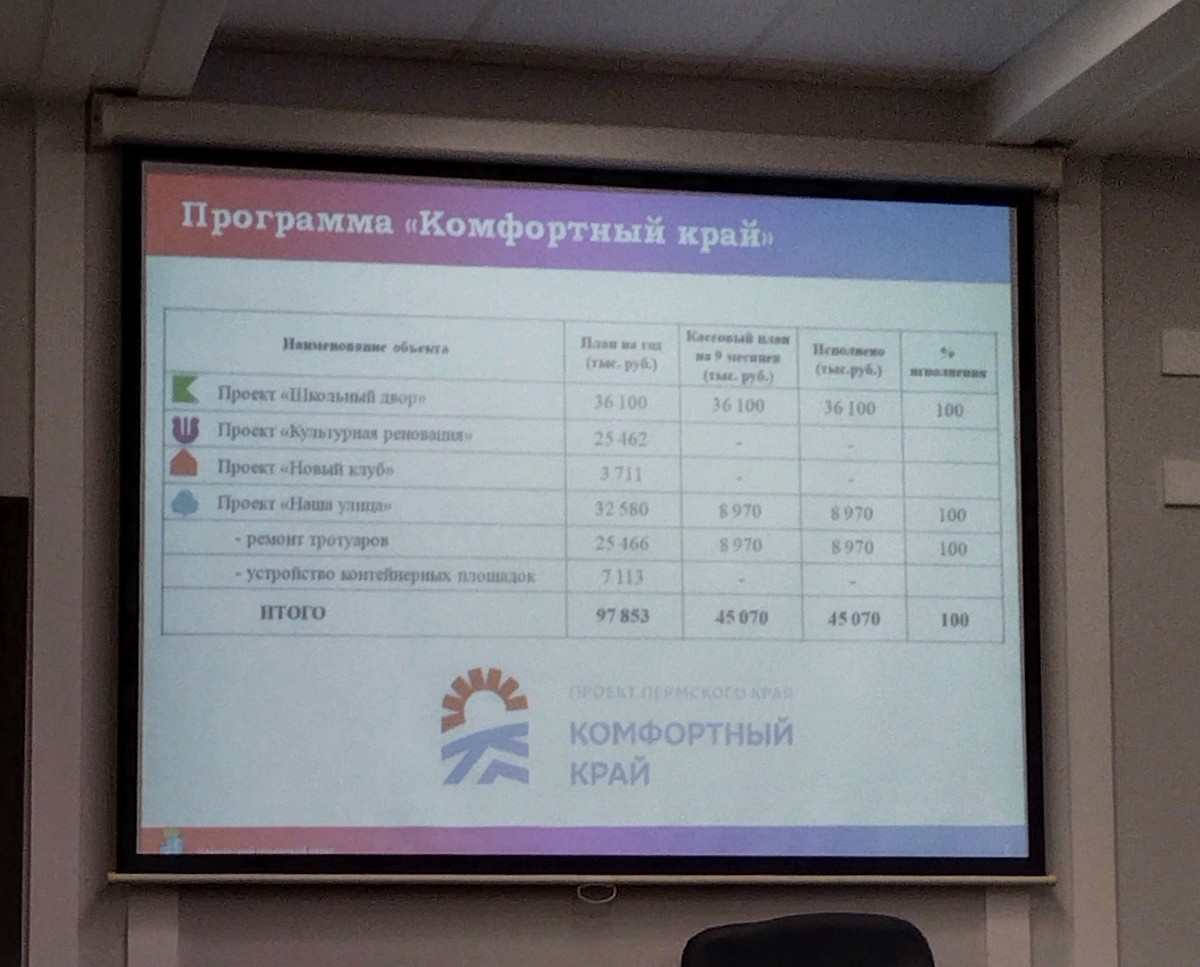 По региональной программе «Комфортный край» были привлечены средства на реализацию четырех проектов (школьный двор, культурная инновация, новый клуб и наша улица) в размере более 97 млн рублей. За отчетный период освоено 45 млн рублей, что составляет 46% от годовых значений.Фото: 59region.ru