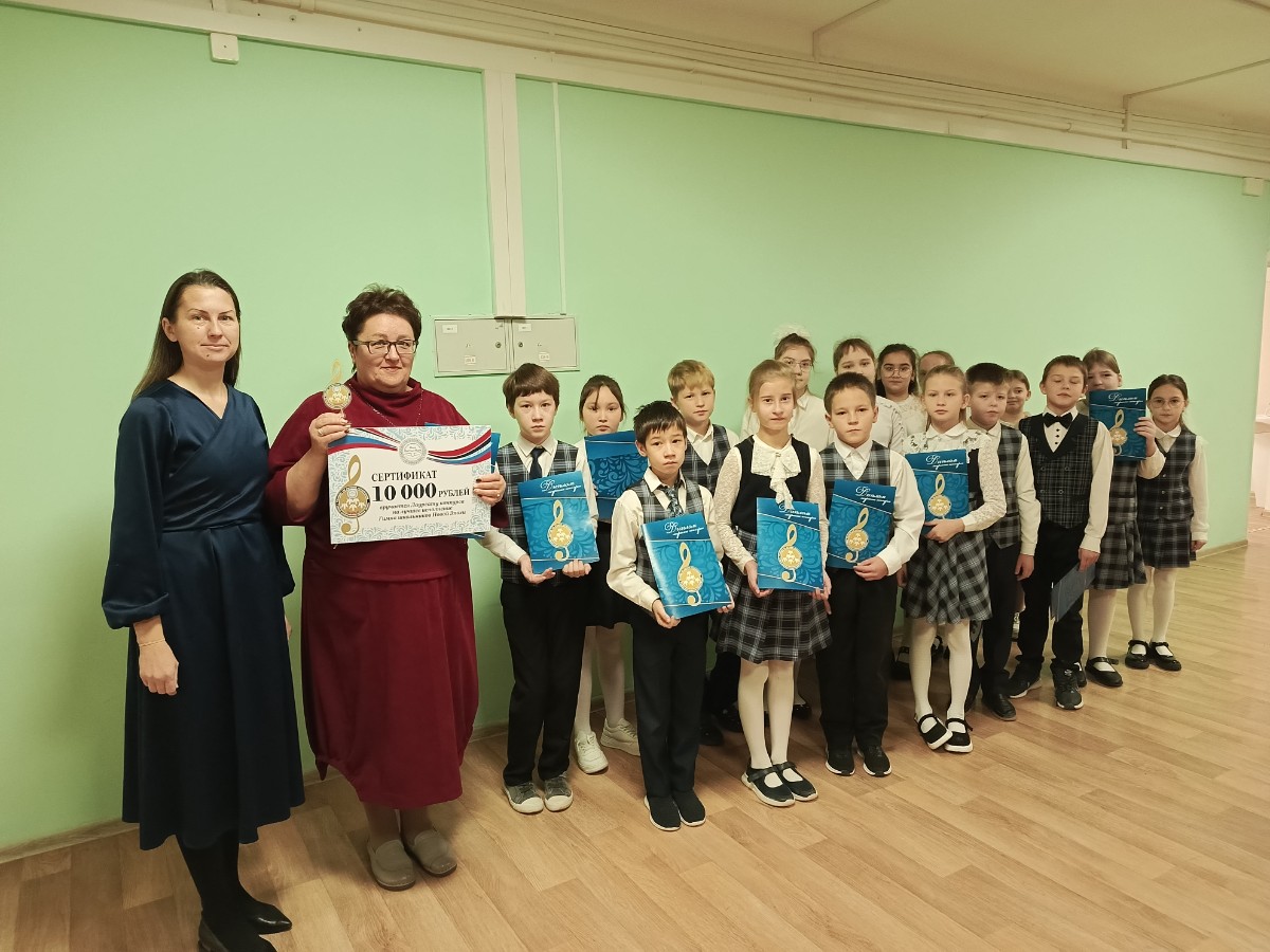 После исполнения гимна состоялась торжественная часть – награждение победителей конкурса. Лучшие исполнители гимна и их руководитель Галина Ивановна Мерзлякова, учитель начальных классов Уральской школы, получили заслуженные награды из рук директора фонда. Хорошим дополнением к ним стала денежная премия – 10 тысяч рублей. Благотворительную поддержку конкурсу оказал «Единый пункт выдачи заказов», который находится по адресу: ул. Мира, 1а.