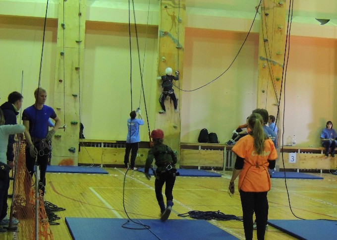 Параллельные перила, брусья - так называются элементы спортивного туризма. Однако есть и еще одна его разновидность. Спортивный туризм в закрытых помещениях. Забраться под самый потолок зала Марковской ДЮСШ, выполнить перехват и спуститься в другой конец зала, затем влезть по имитированной скальной поверхности на самый верх и снова перебраться в другой конец зала. Это только на первый взгляд все выглядит так просто. На самом деле, участники должны соблюсти все правила выполнения элементов - параллельных перил, к примеру, - и не забыть про время. Одна из немногих девочек на таких соревнованиях - это участница из Березников, Вероника Микова. "Мне очень понравилась ваша дистанция", - делится девочка, - "Она одновременно и сложная, и заставляет вспомнить все навыки. Здесь собрались достойные соперники, у меня очень сильные конкуренты". Ее тренер, Сергей Николаевич Кокшаров, следит за тем, чтобы команда успешно выполняла все элементы заданий Кубка Федерации Пермского края по спортивному туризму. В составе команды 5 человек, и не всем удается справиться с поставленными перед ними задачами. А вот ребятам с Чайковской станции туризма сегодняшняя дистанция кажется не очень сложной. Они с успехом проходят все элементы. Кирилл и Роман, воспитанники Чайковской станции туризма, рассказали: "Дистанция на самом деле не очень сложная, просто она длинная, и пока ее проходишь, немного устаешь. А так все отлично. Нам понравилось все!".