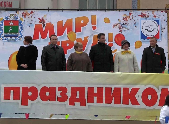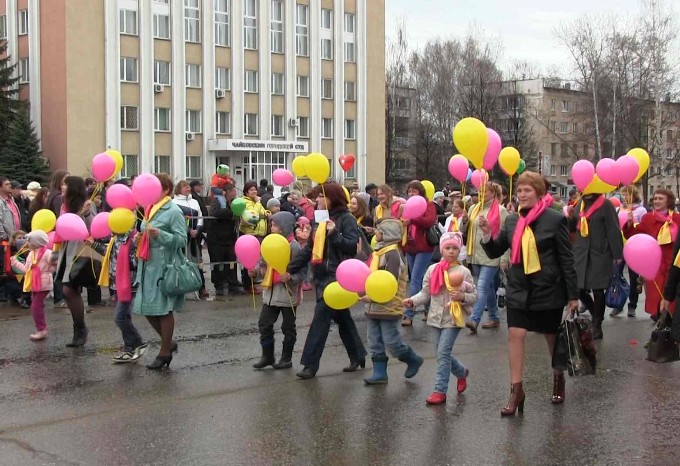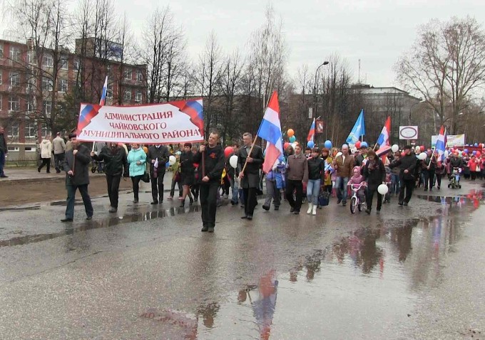 Шествие началось от дома быта "Элегант", протянулось через всю улицу Ленина, площадь Карла Маркса, и заканчивалось только около гостиницы "Волна". Колонн с участниками было не просто много, а очень много! Судите сами: наша колонна готовилась выйти только в 12-30 от детской поликлиники, так как была в конце списка всех пожелавших пройтись на демонстрации организаций и предприятий. Если говорить об общем числе участников, то их было несколько тысяч человек! Среди участников демонстрации были и жители города, и населенных пунктов Чайковского района. Среди них были представители различных организаций - детских садиков, школ, образовательных учреждений дополнительного характера, спортивных секций, различных кружков и клубов, а также сотрудники городских предприятий и частные предприниматели. Каждый нес в руке символ своего места работы или учебы или просто шарик или цветок. В общем, атмосфера демонстрации, как всегда, была радостной и торжественной. Колонны торжественно прошли перед президиумом - сценой, на которой находились первые лица города и Чайковского района. Было отмечено каждое предприятие или организация. Никто не остался без знака внимания.