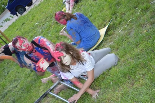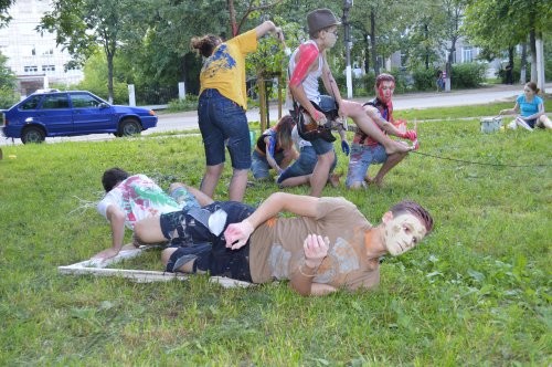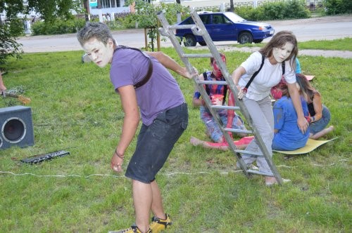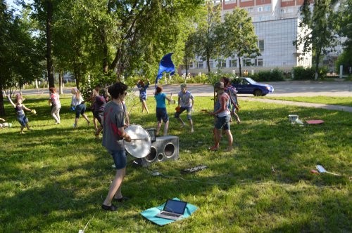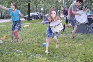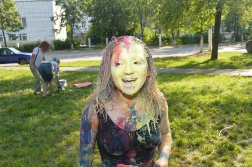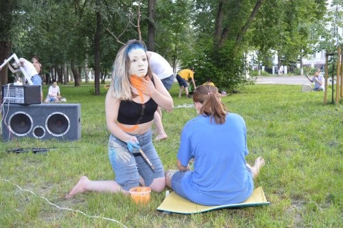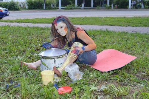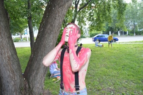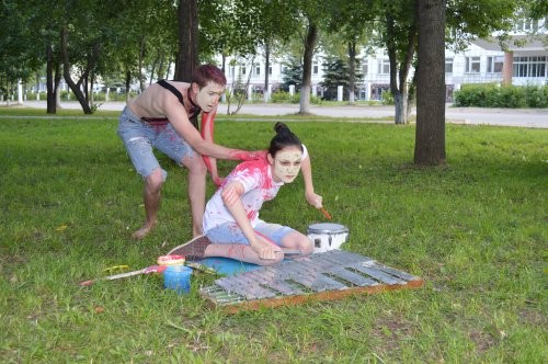 Странные звуки огласили аллею славы в 7 часов вечера 28 июня. Эти ребята - вовсе не пациенты психоневрологического диспансера, а студенты актёрского отделения Чайковского музыкального училища, подготовившие для сайта 59region.ru очень интересную и современную постановку на тему интернета в стиле "Буто". Им предстояло изобразить различные виды информации, размещаемые на сайте, пользователей и интернет в целом. Кстати, в этот день у них проводились экзамены по театральному искусству и это представление стало одним из зачетов. Аделя, студентка второго курса, была рада попробовать свои силы на публике и призналась, что ей больше всего понравилось лить и разбрызгивать краску во все стороны, понемногу отдавая свое хорошее настроение зрителям.