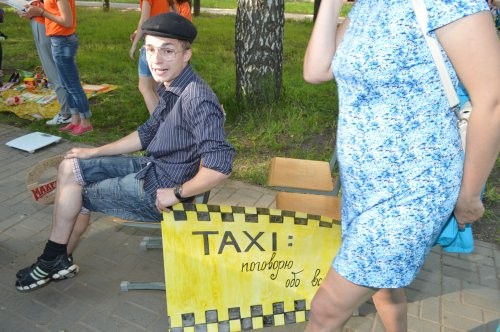 После того, как студенты провели свою арт-инсталляцию, зрители отправились посмотреть и на другие объекты Вечернего Молодежного Арбата. А посмотреть было на что. Бойко шла торговля самыми различными вещами - от реальных пирожков и булочек, деревянных изделий, шкатулочек и брошек до обнимашек и хорошего настроения. Например, на одном из участков Арбата свои услуги всем бесплатно предлагал таксист Дядя Ашот.