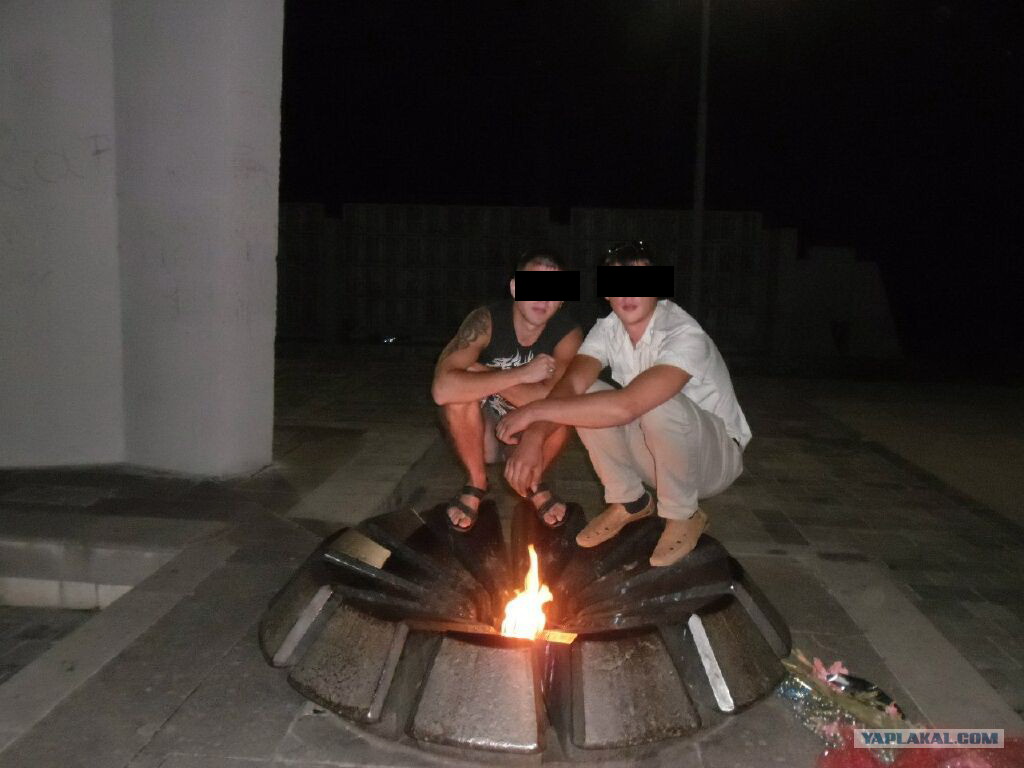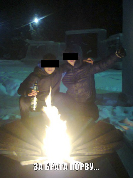 Второй случай «прославления» любимого города можно охарактеризовать уже классическим Интернет-мемом – «Слабоумие и отвага». Последнего здесь не так и много, зато первого предостаточно – два молодых человека решили погреться у Вечного огня, присев у него на корточки и, конечно, же, запечатлели себя на память.