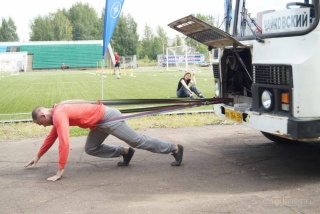 «Человек-паук» нелегко, но упорно тянул на себе ПАЗик весом в 7.5 тонн на турнире по силовому экстриму, прошедшему 8 августа в рамках празднования Дня физкультурника.