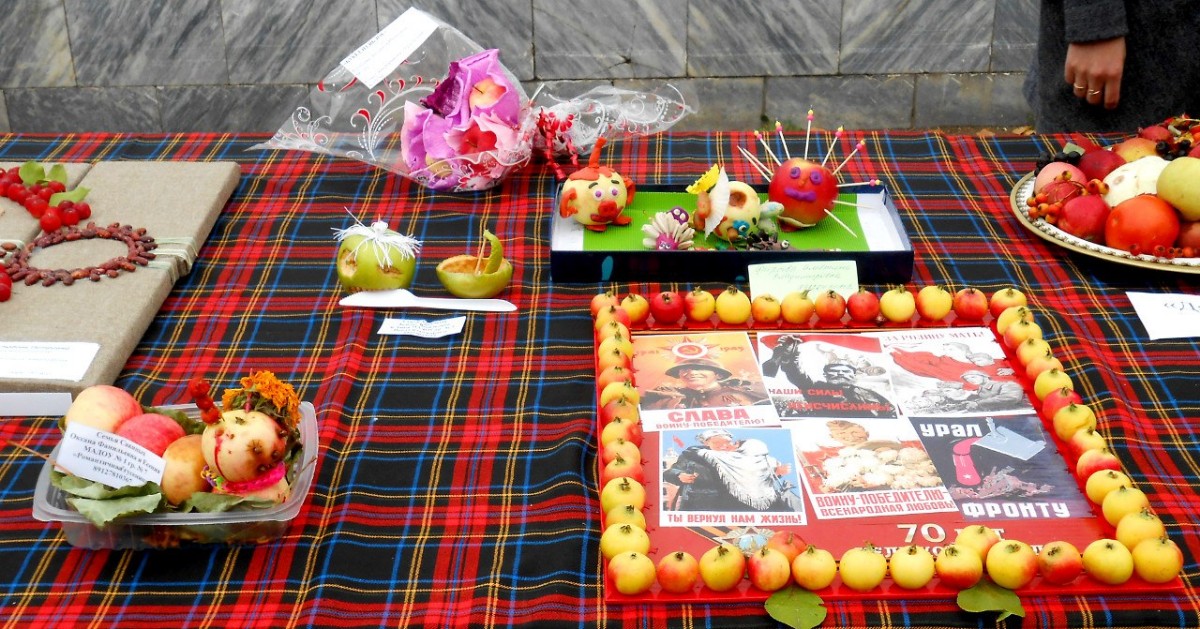 Отдельно стоит отметить, что на праздновании было представлен отдельный лоток с поделками из яблок. Вот тут и понимаешь, что на самом деле яблоко можно использовать не только в качестве пищи. Из фруктов были сделаны персонажи мультфильмов и сказок, «живые» натюрморты, целые композиции и т. д. Фантазии участников импровизированной выставки на открытом небе можно позавидовать.