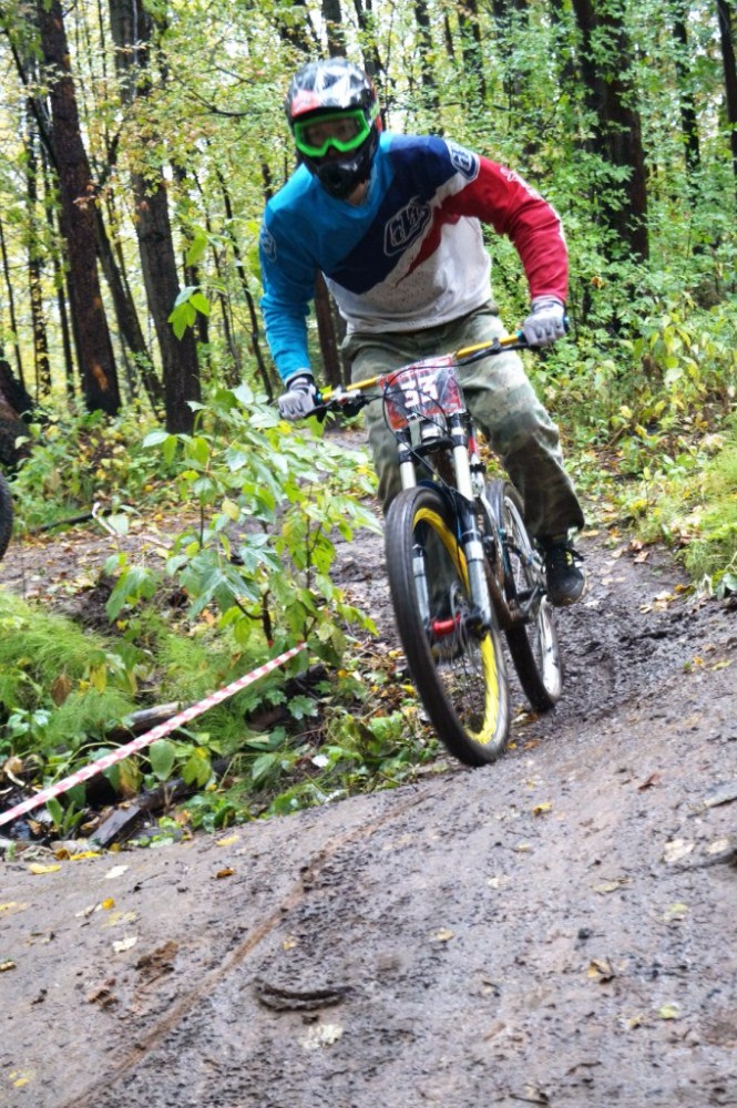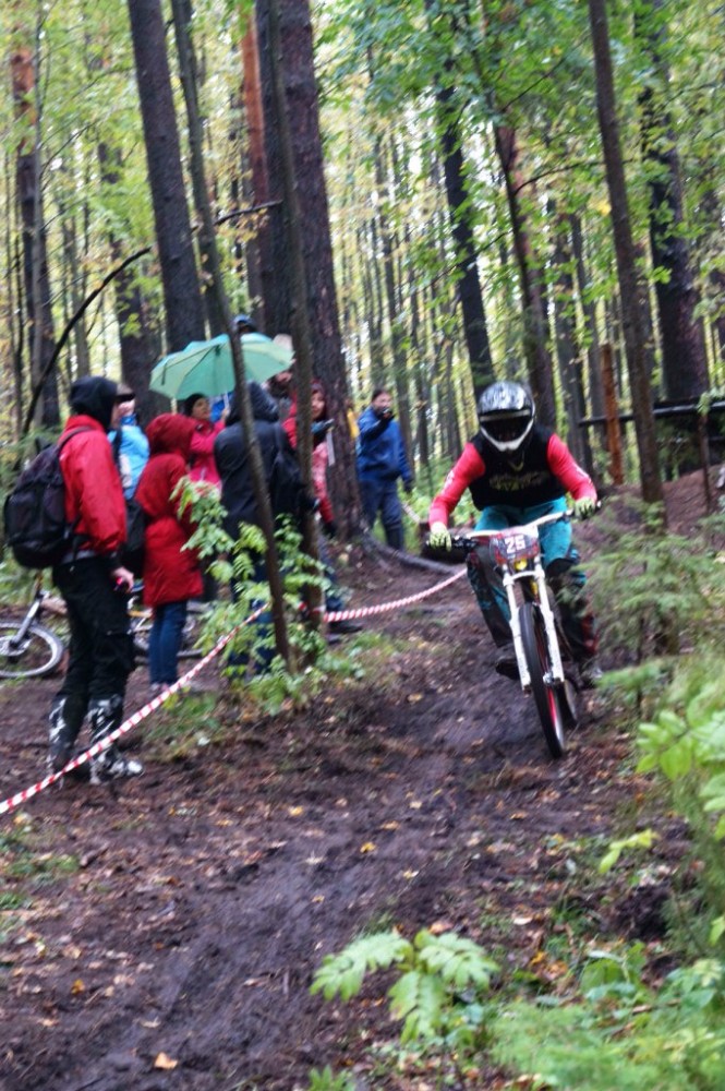 Приехав на место, сомнений не осталось – действительно придется, или плыть, или скользить. Соревновательная трасса была настолько мокрой, что по ней было крайне сложно перемещаться даже пешком, а лужи местами были настолько глубокими, что уже заранее было жаль райдеров. Их же это не особо смущало – оставляя после себя глубокие колеи и поднимая фонтаны из грязи и воды, они мчались на большой скорости. Не удивительно, что спустя час даже самая красивая спортивная форма покрылась толстым слоем грязи. В брызгах и потеках были и лица участников соревнований, несмотря на то, что во время спуска они были закрыты шлемами и масками.