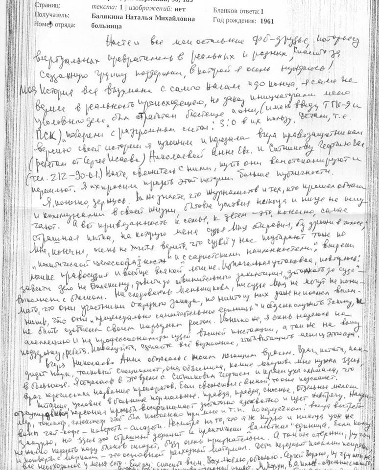 На протяжении двух месяцев дело Натальи Балякиной обсуждалось на различных уровнях. Особо пристальное внимание к персоне Натальи Михайловны приковано в Facebook, где в группе «За правосудие!» был открыт сбор средств и посылок для заключенной. Там же регулярно публикуются новости от родственников Балякиной и письма, написанные ею в тюремной больнице. Вот пример того, как Наталья Михайловна видит происходящее (выдержка из письма, опубликованного 11 ноября):