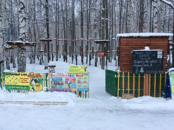 Сейчас в веревочном парке «БАЛУ» вы можете принять участие в двух акциях: только зимой 2 круга по цене 1 и «Мама, папа, я» (подробнее на территории парка). Принимаются коллективные заявки на прохождение трассы и проведение праздников (верёвочный курс): vk.com/vpbalu, 8-922-3023-969.