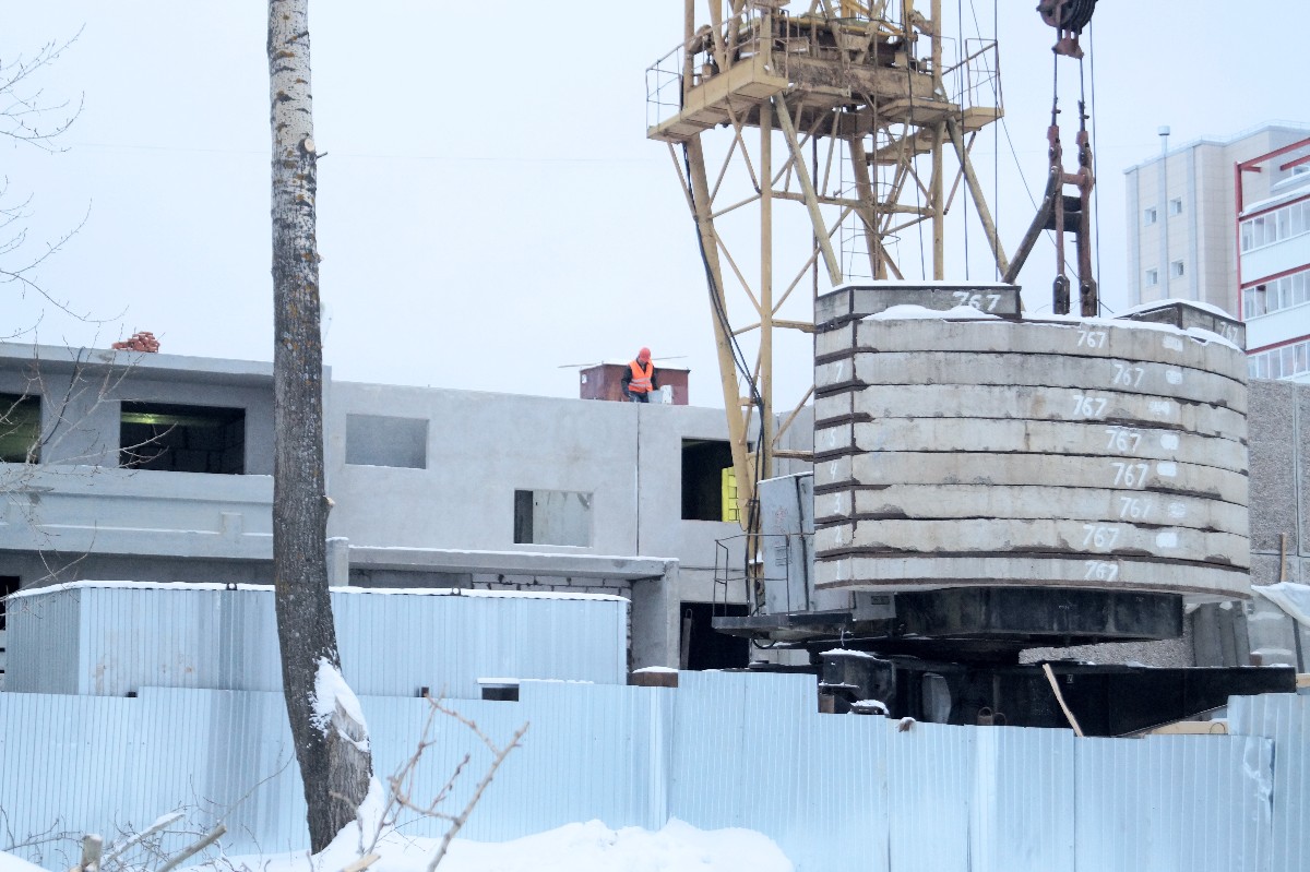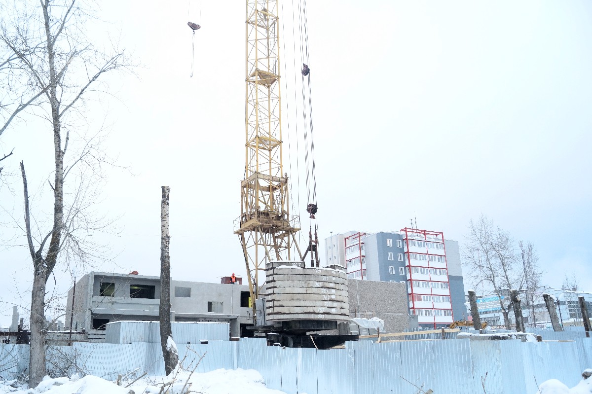 – Строительство ведется в ежедневном режиме с 8 до 19 часов. В зависимости от вида работ, на объекте в постоянном режиме находится от 25 до 35 человек. В строительном процессе на текущий момент задействованы все необходимые механизмы и спецтехника. Монтаж стеновых панелей осуществляется с помощью башенного крана КБ-405-1. Также на объекте присутствуют погрузчик, экскаватор и кран МКГ-25. У специалистов есть все необходимые спецсредства для производства работ.