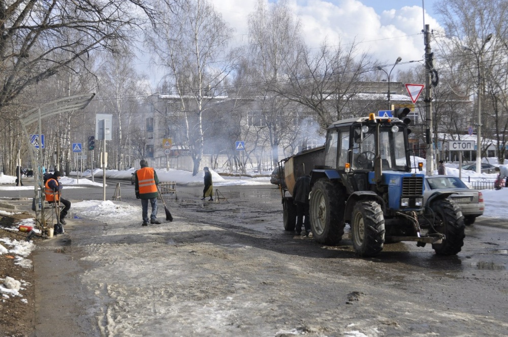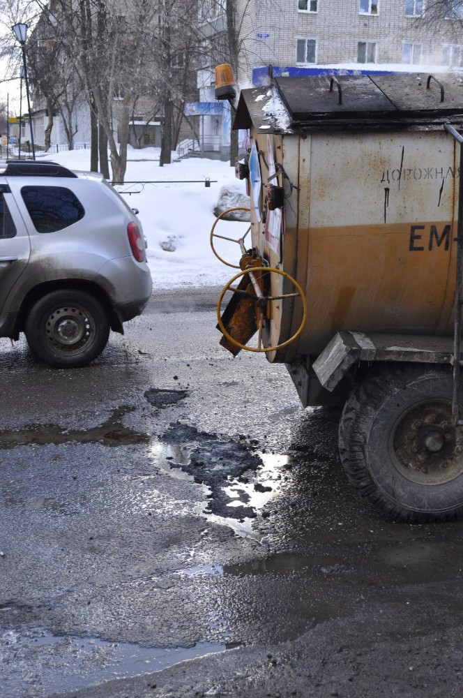 Видимо, подрядная организация решила в очередной раз воспользоваться солнечной погодой. Напомним, первые ямки ООО «СМУ № 5» начала заделывать возле памятника первостроителям несколько дней назад. Однако снег и мороз помешали работам.
