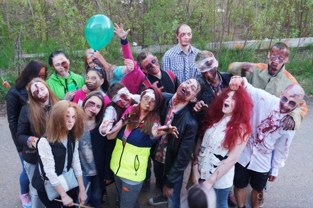 Зомби-шествием чайковские школьники и студенты решили отметить пятницу тринадцатое. День, наполненный суевериями, они наполнили смехом. Смеясь, они разрисовывали свои лица за Чайковским музыкальным училищем, окрашивая их в оттенки красного и фиолетового. Не обошлось без землисто-коричневых и даже зеленоватых оттенков. Если «зомби» не могли разукрасить себя кровавыми пятнами самостоятельно, к ним на помощь приходил Илья Ислаев – актер Народного театра юного зрителя.