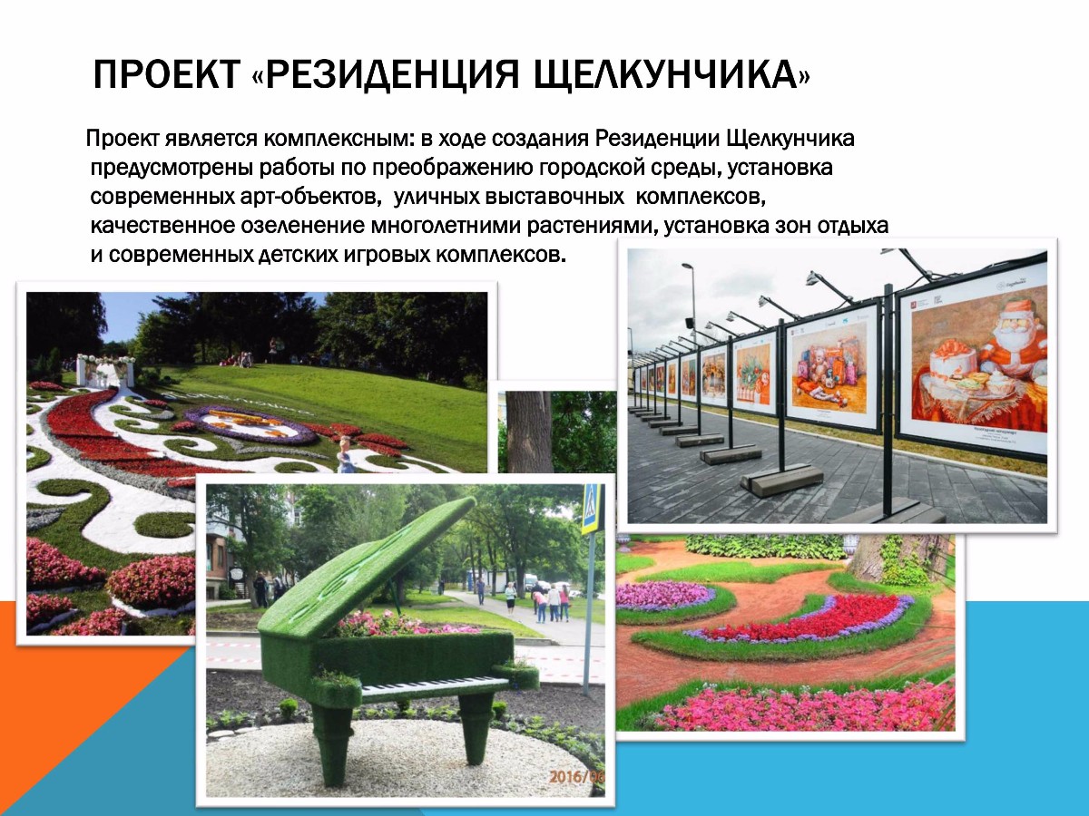 Проект является комплексным: в ходе создания Резиденции Щелкунчика предусмотрены работы по преображению городской среды, установка современных арт-объектов, качественное озеленение многолетними растениями, установка зон отдыха и современных детских игровых комплексов.
