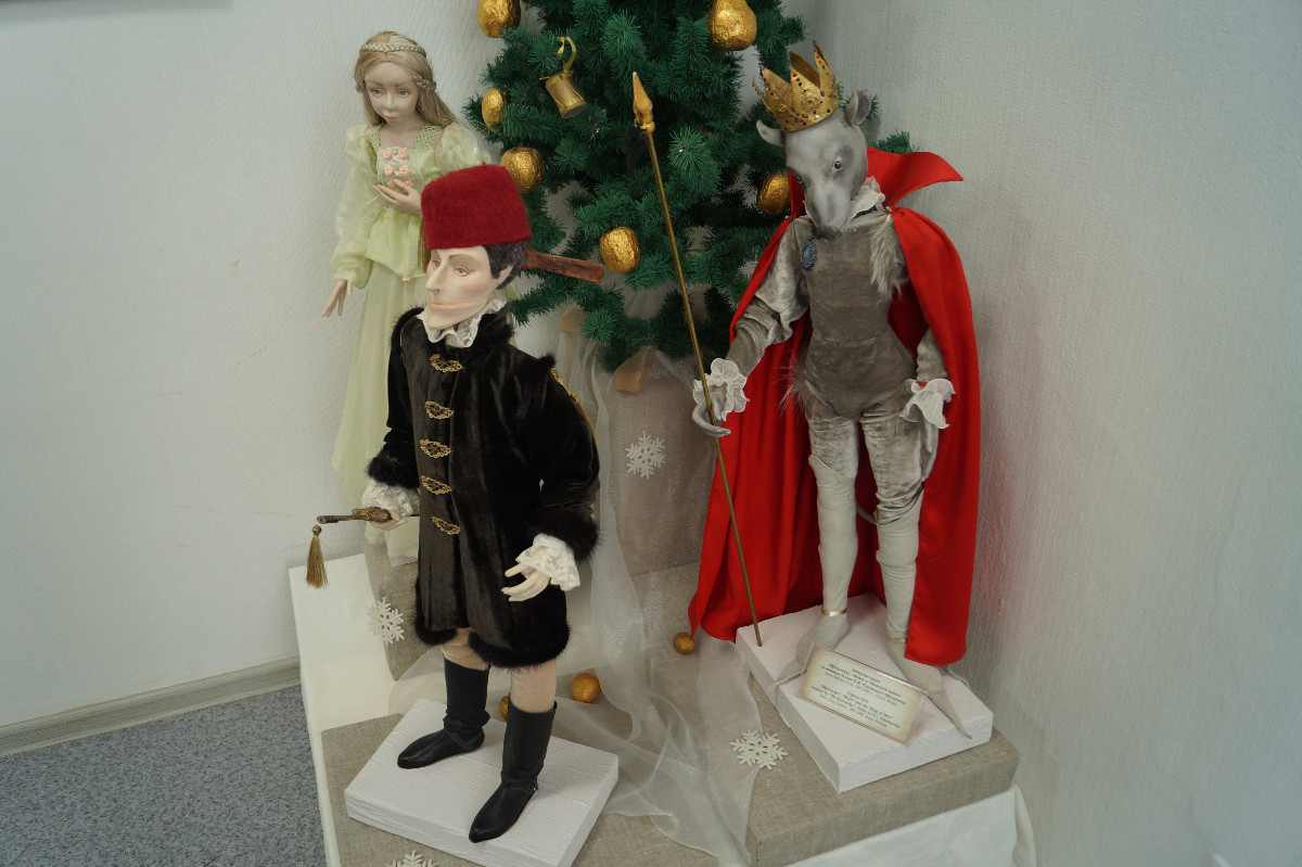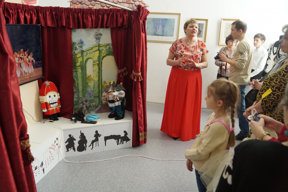 Стоит только открыть дверцу – и ты видишь сюжеты из сказок Шарля Перро, которые легли в основу либретто великого композитора или портрет всемирно известного балетмейстера Мариуса Петипа. А вот и знаменитый на весь мир персонаж – Щелкунчик. Заглянув в одну из выдвижных коробочек, можно обнаружить атрибуты танцовщицы - балетную пачку и пуанты. Маленькой посетительнице выставки Марии предложили их надеть и встать к перекладине станка. Лежащие на полу следы-подсказки балетных позиций позволяют девочке принять классические па.