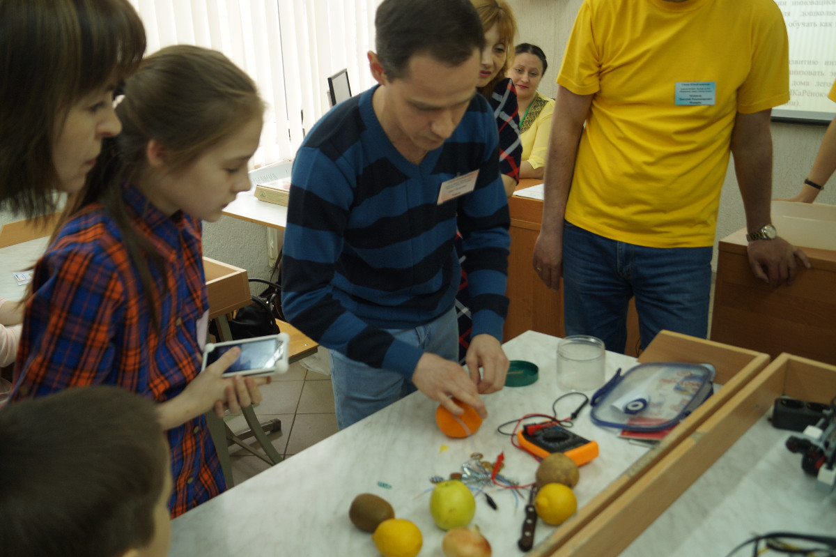 Всеобщее внимание также привлек родитель из детсада №24 «Улыбка», который показал как из яблока, лимона или лука сделать элемент питания – аналог батарейки.